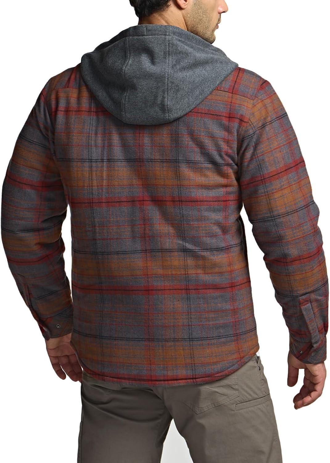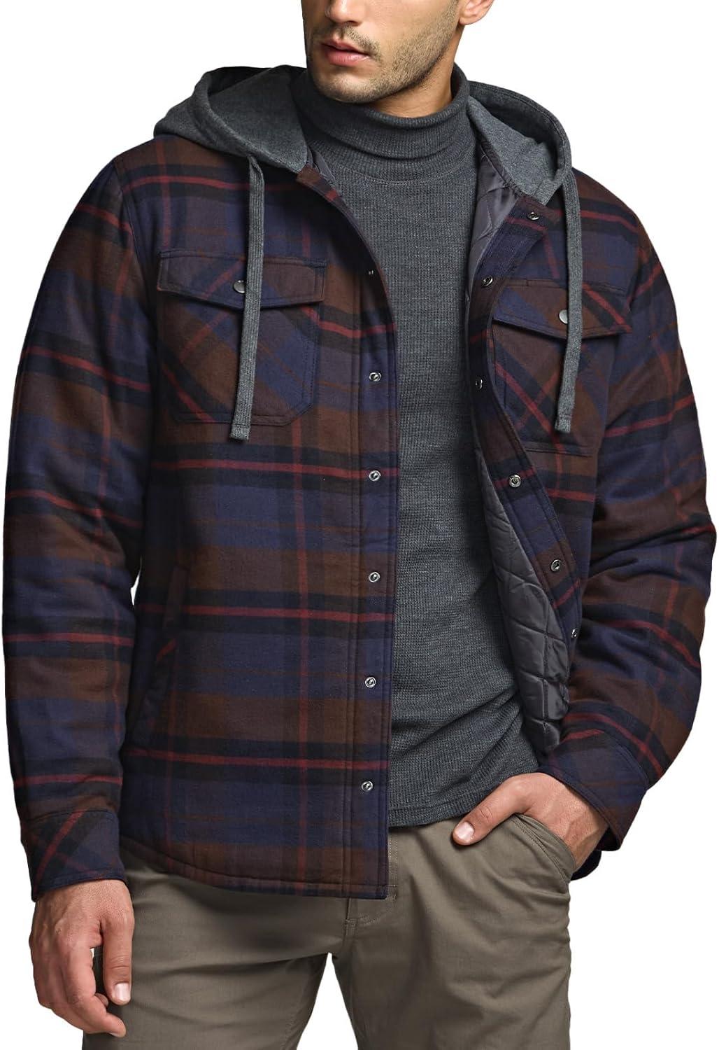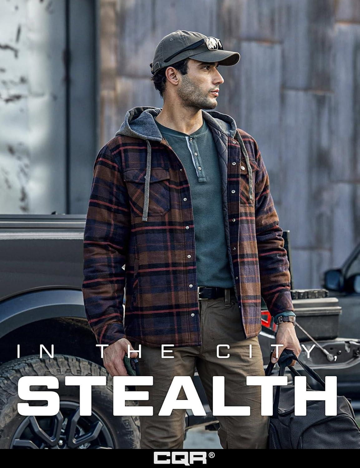 CQR Men’s Quilted Lined Flannel Hooded Shirt Jacket, Soft Warm Long Sleeve Outdoor Cotton Plaid Shirt Jackets(Stealth Harvest)