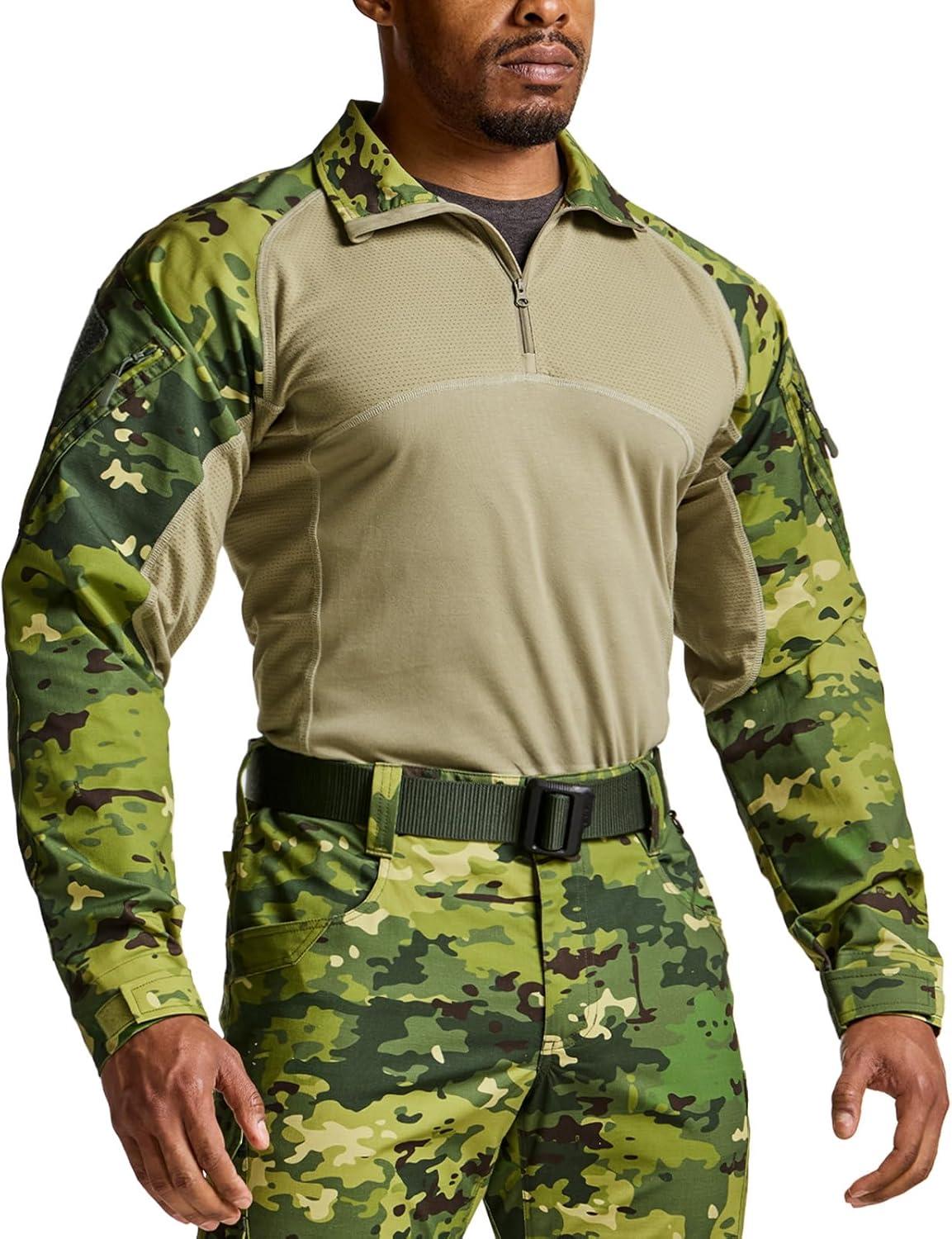 CQR Men’s Combat Shirt Tactical 1/4 Zip Long Sleeve Military BDU Shirts Camo EDC Top with Pockets(Raider Pro Green Kelp)