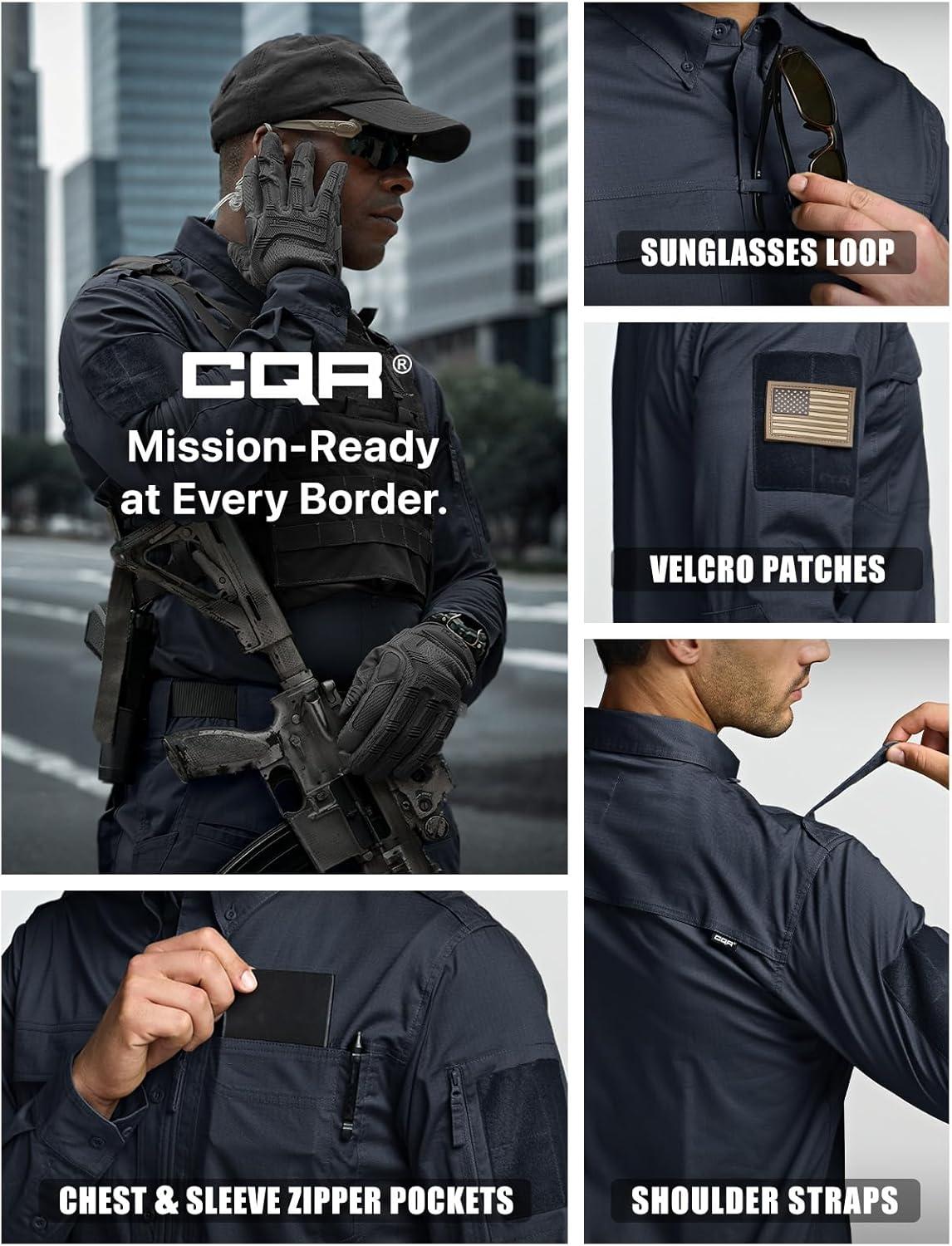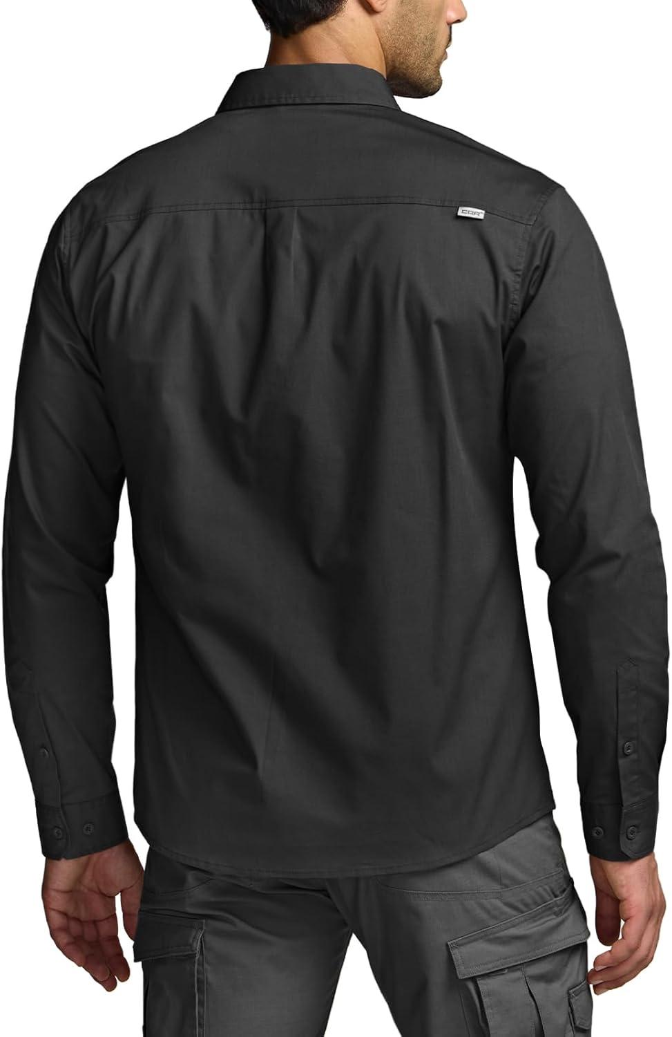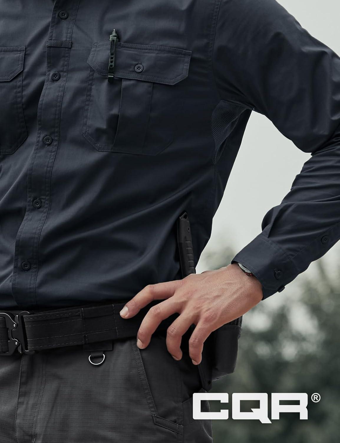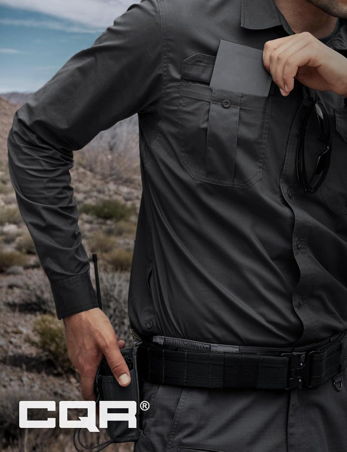 CQR Men’s Long Sleeve Tactical Shirts, Ripstop Military Work Shirts, UPF 50+ Breathable Button Down Outdoor Hiking Shirt(Metro Black)