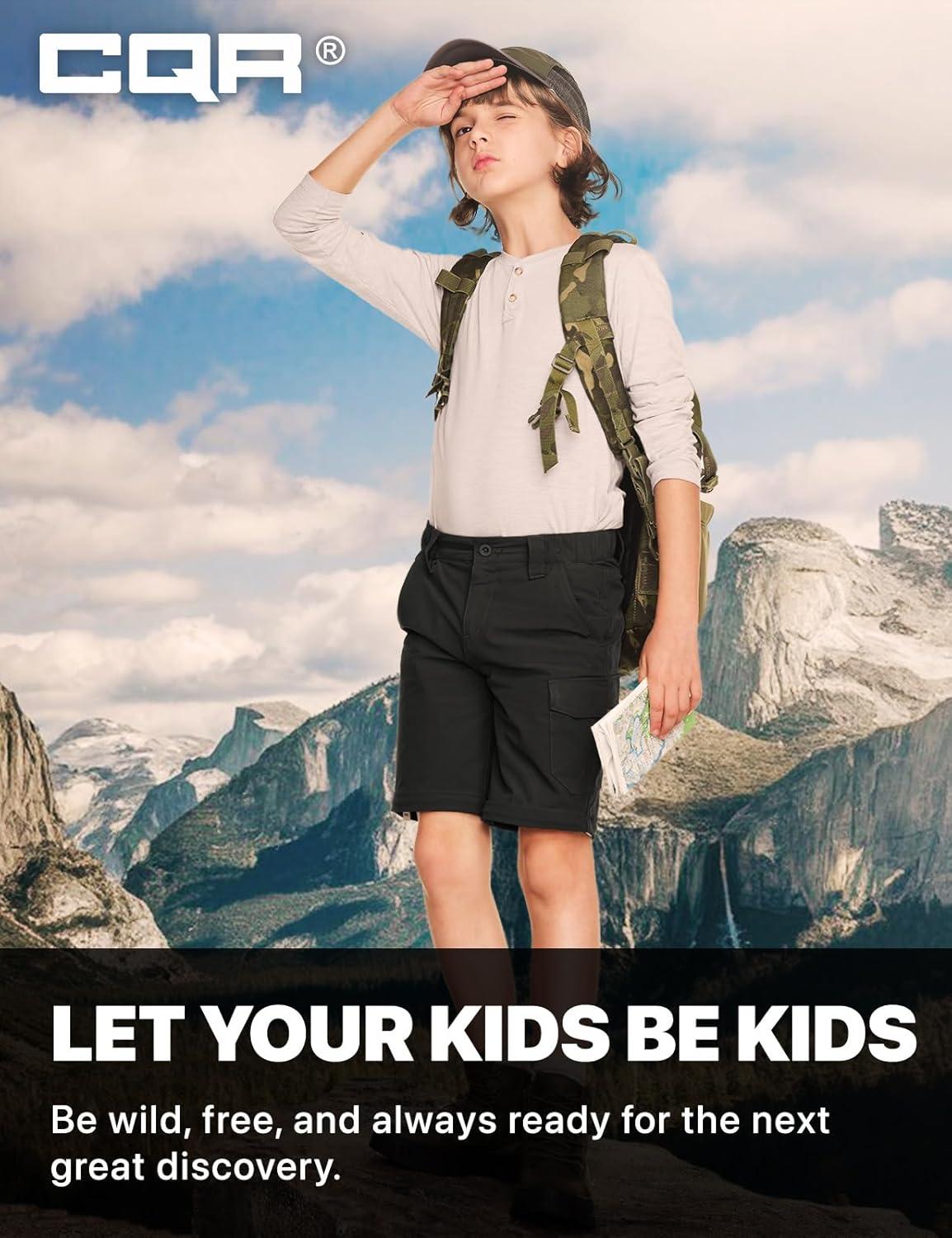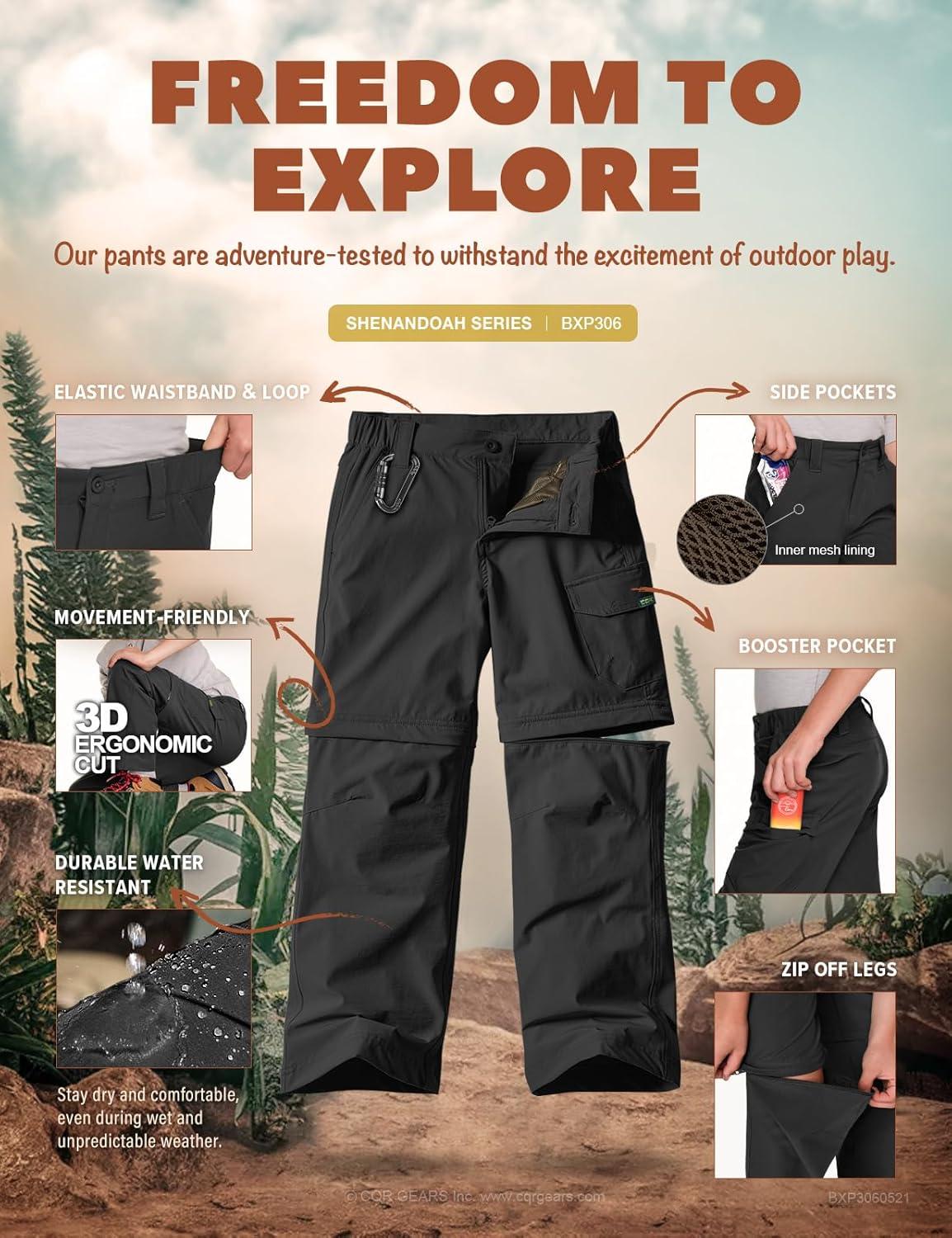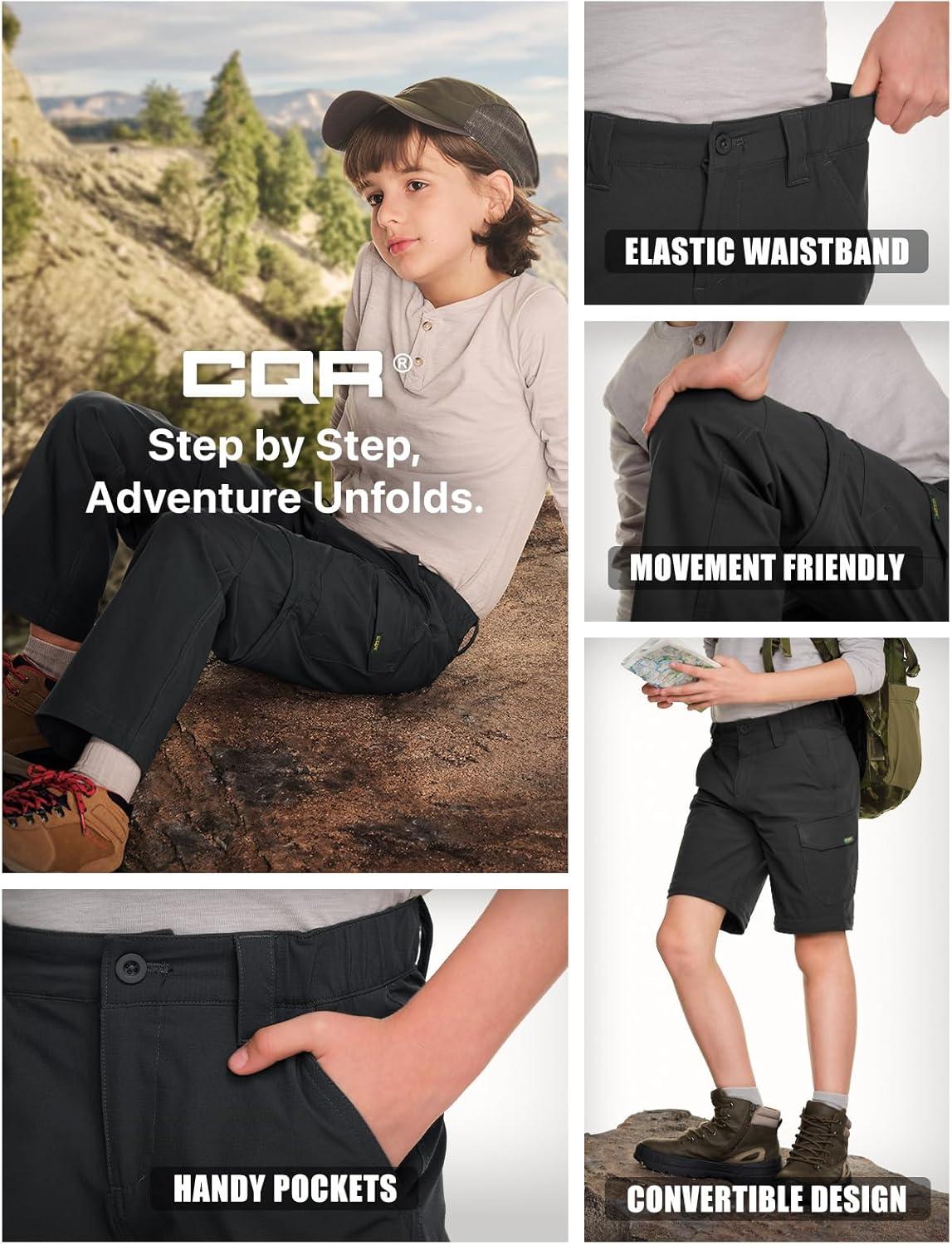 CQR Kids Youth Hiking Cargo Pants, UPF 50+ Quick Dry Convertible Zip Off Pants, Outdoor Camping Pants(Shenah Trek Black)