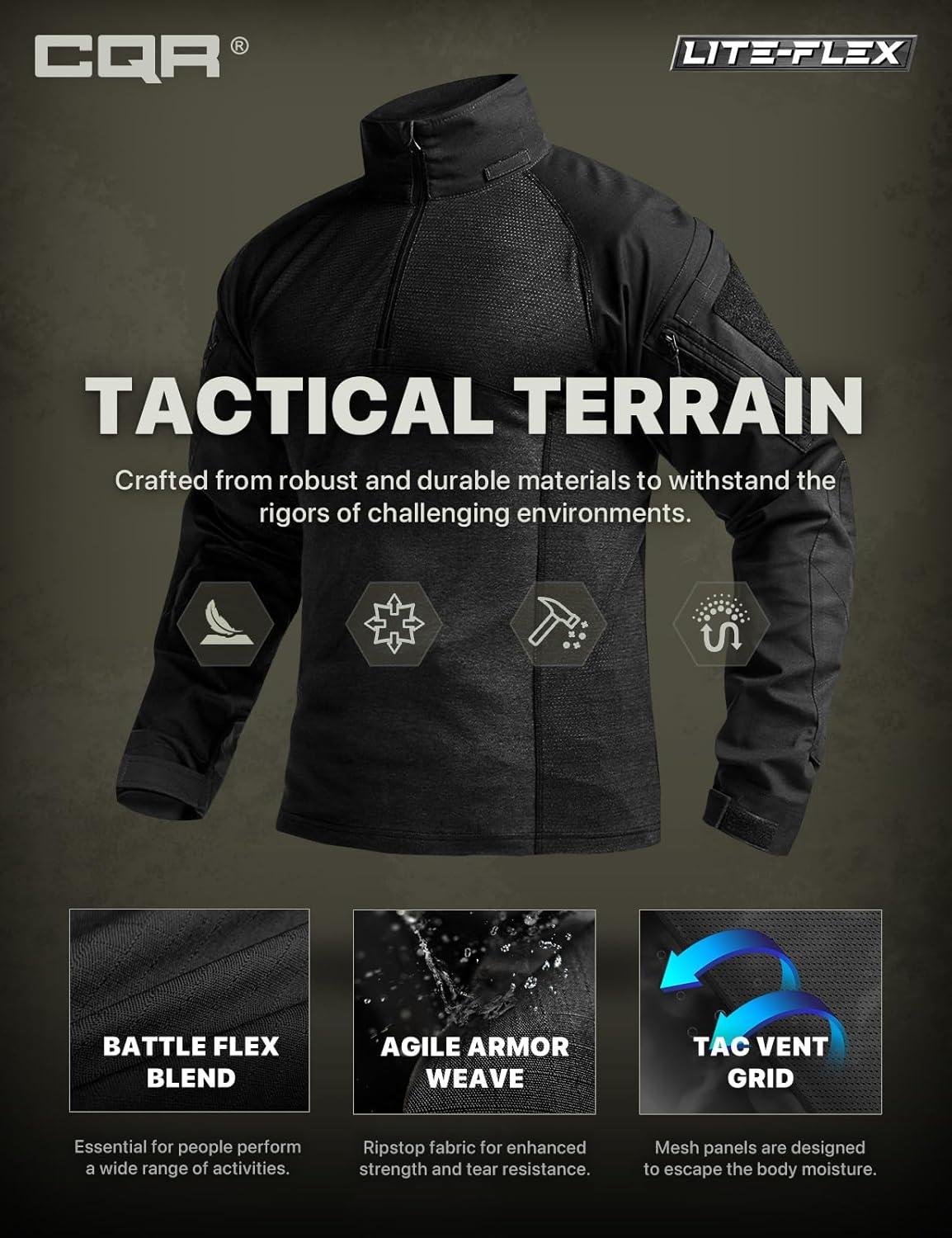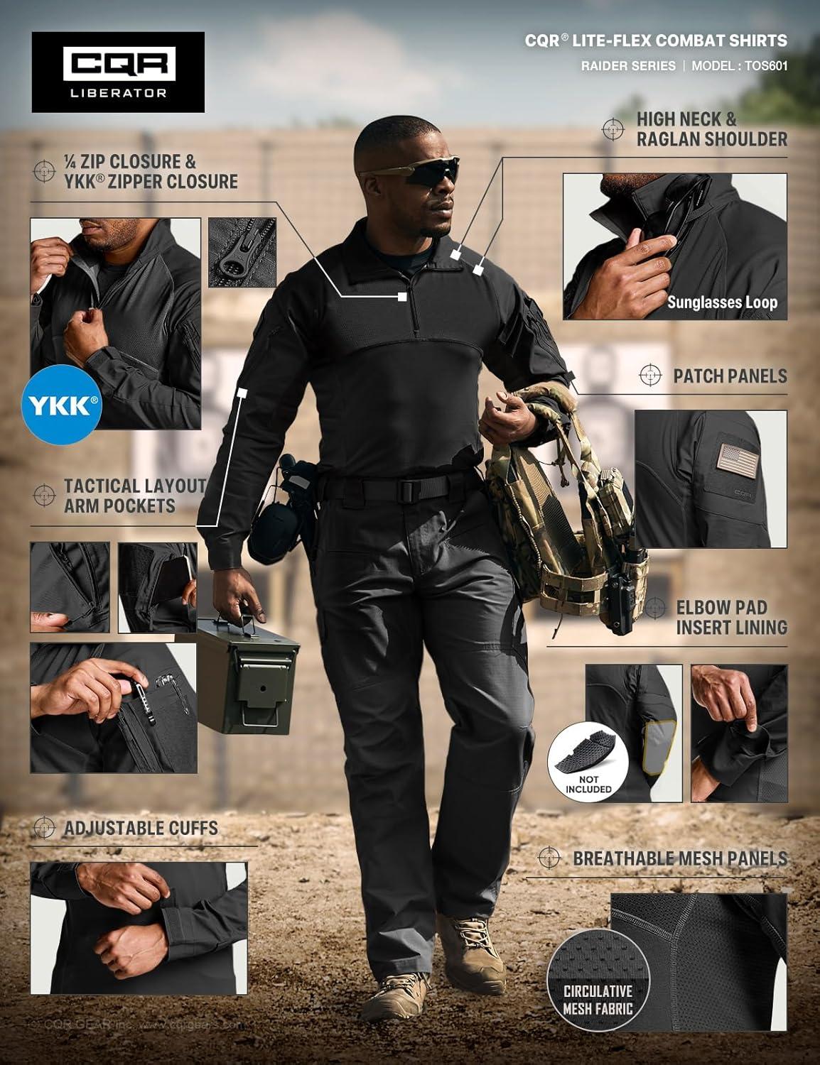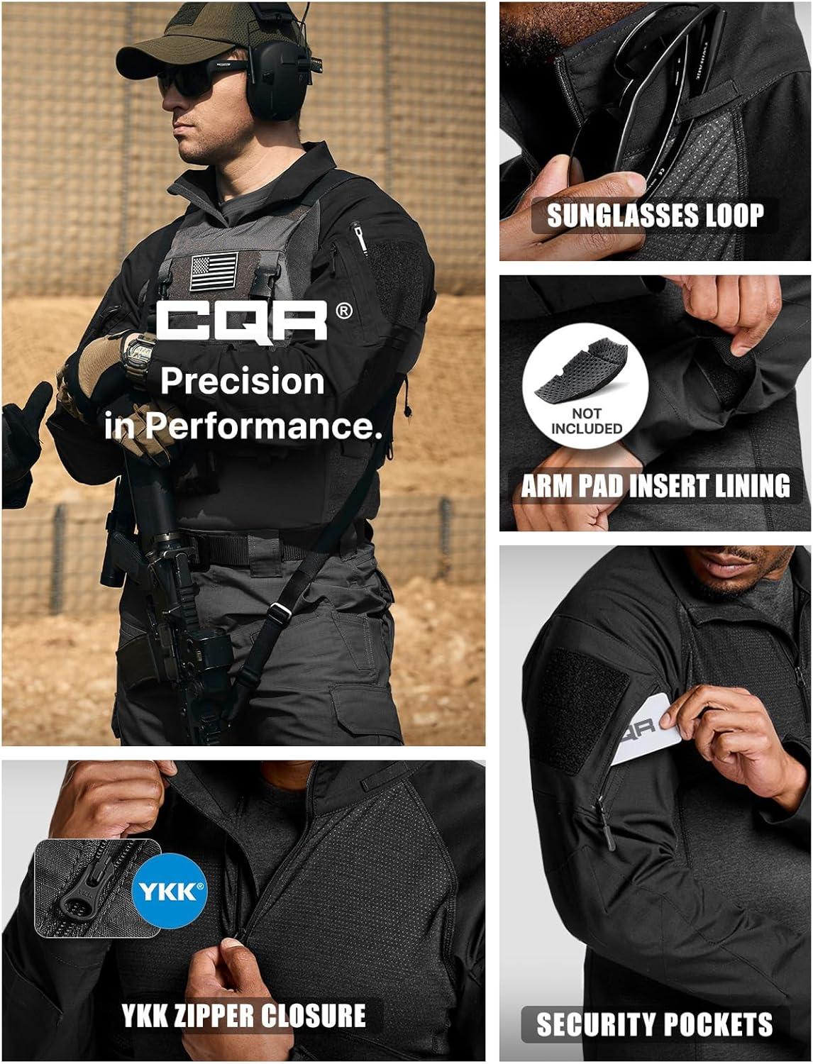 CQR Men’s Combat Shirt Tactical 1/4 Zip Long Sleeve Military BDU Shirts Camo EDC Top with Pockets(Raider Black)
