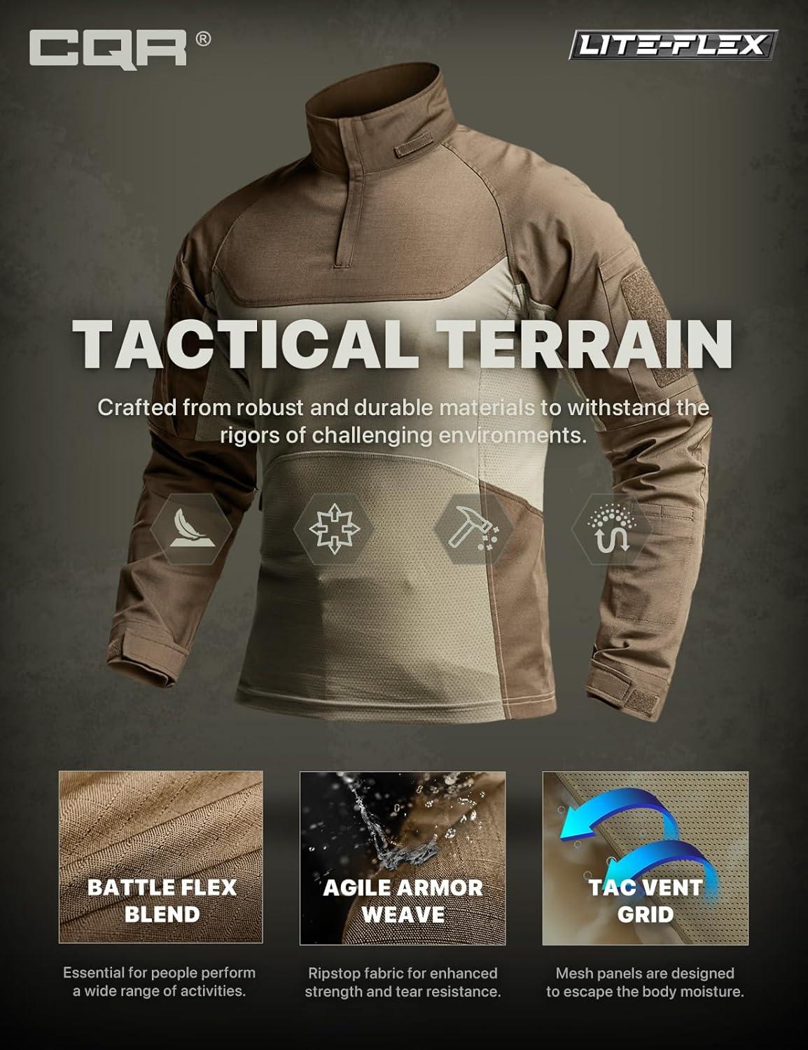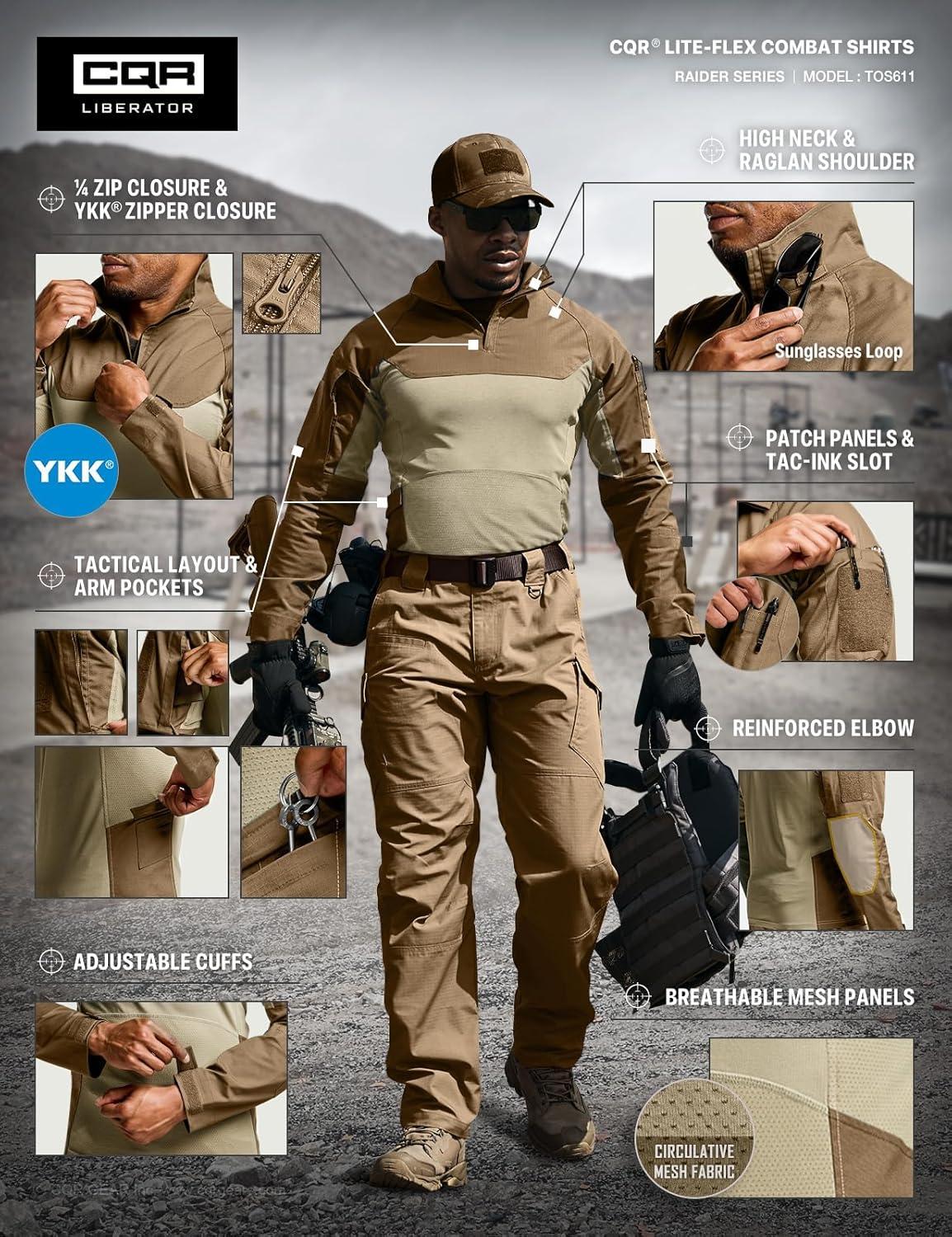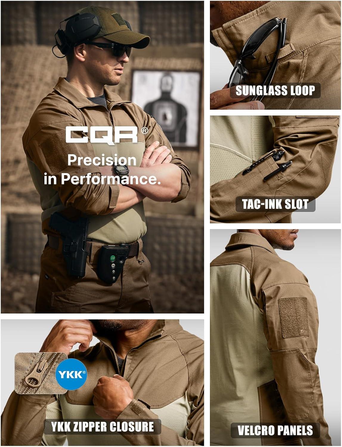 CQR Men’s Combat Shirt Tactical 1/4 Zip Long Sleeve Military BDU Shirts Camo EDC Top with Pockets(Raider Pro Cougar)
