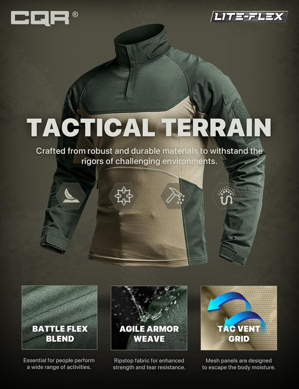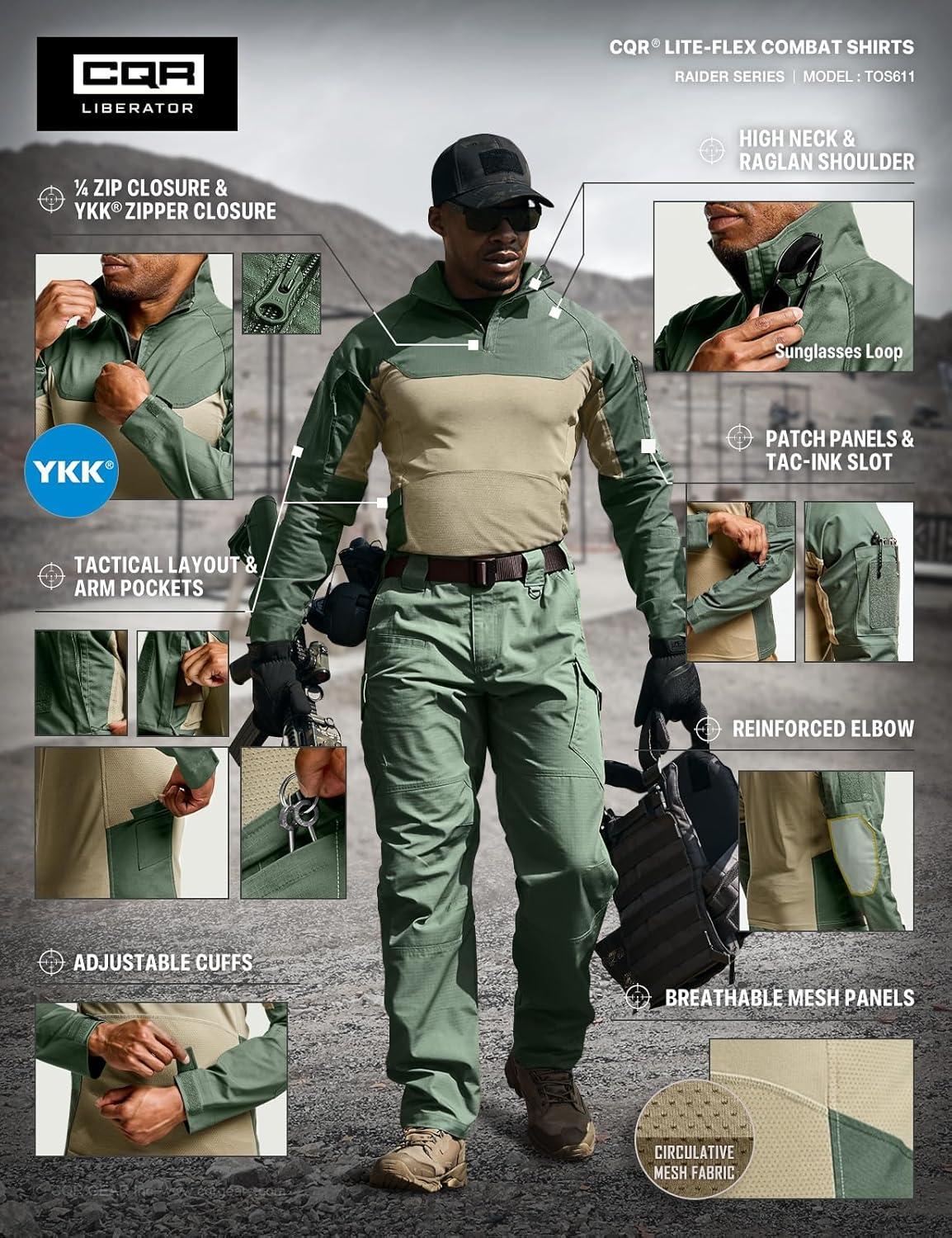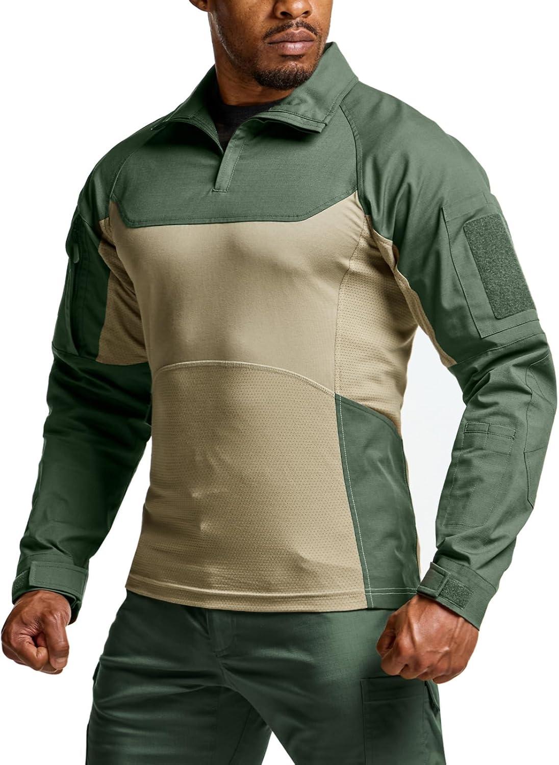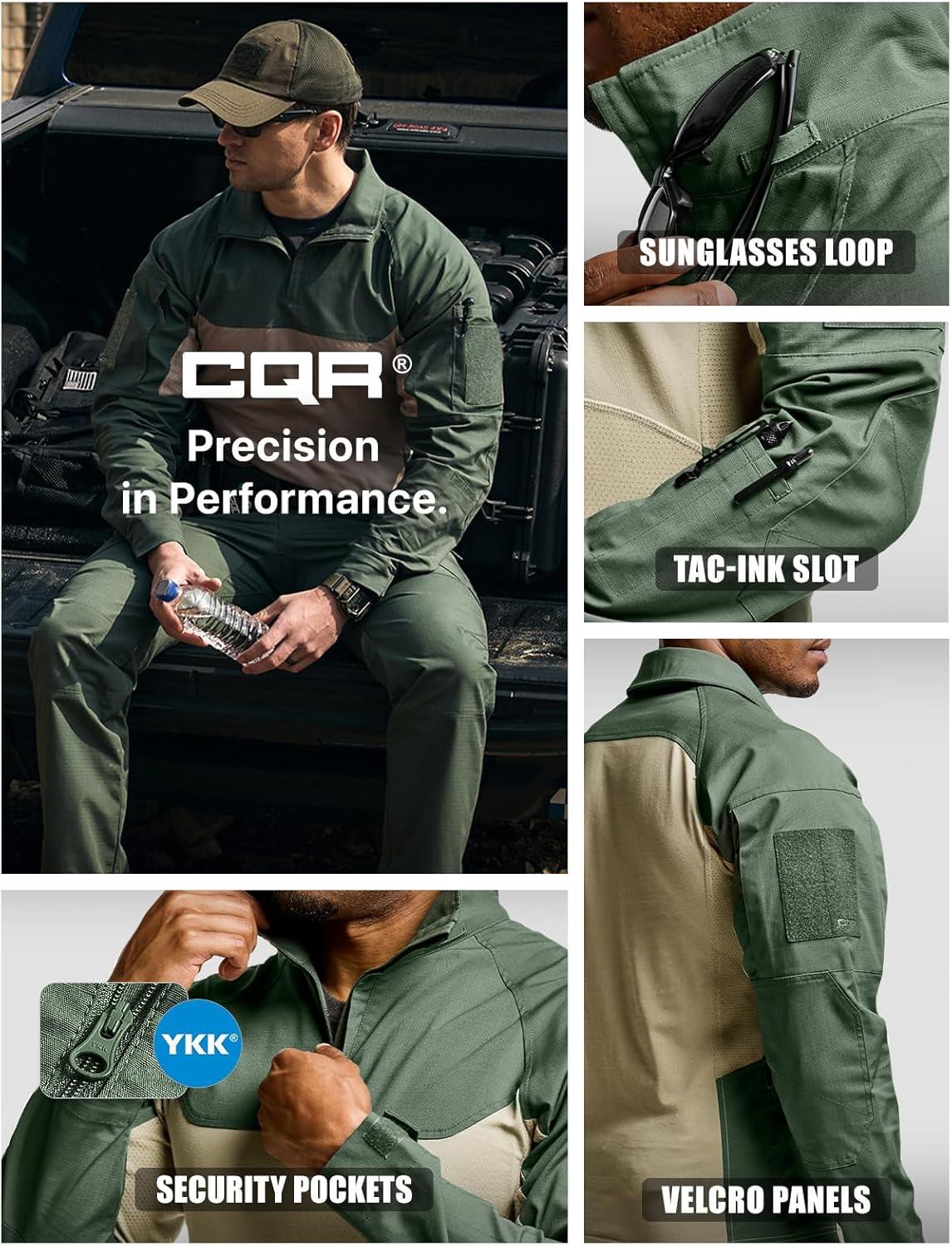 CQR Men’s Combat Shirt Tactical 1/4 Zip Long Sleeve Military BDU Shirts Camo EDC Top with Pockets(Raider Pro Green Kelp)