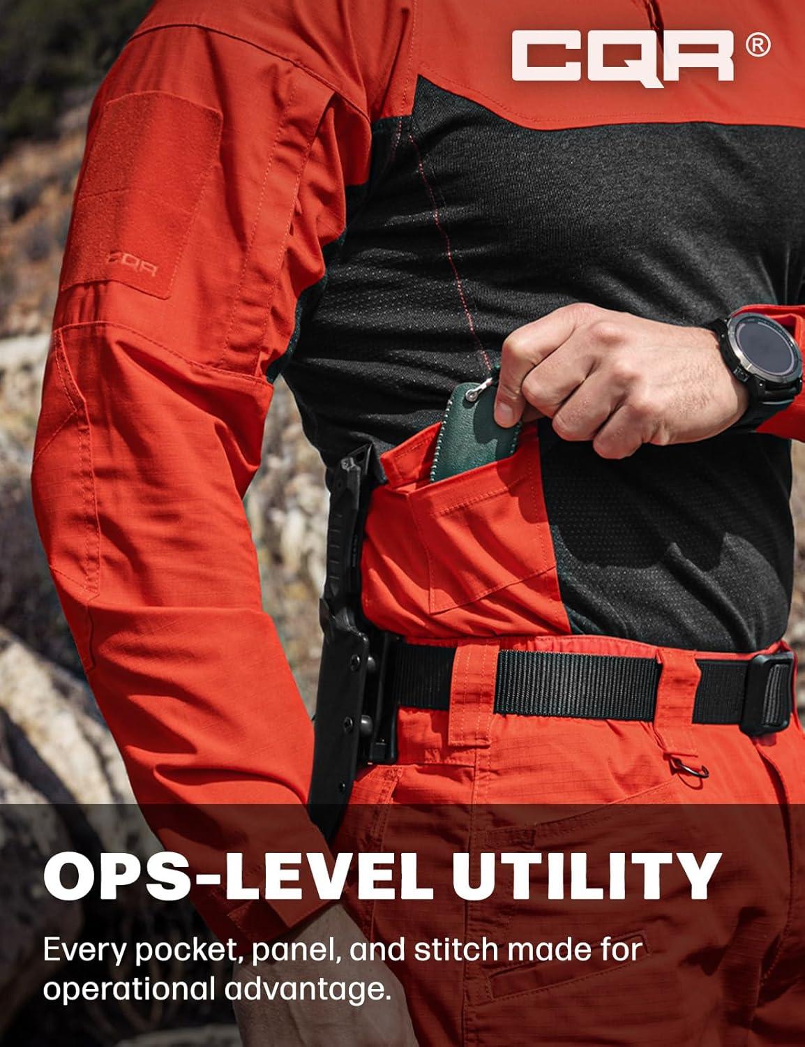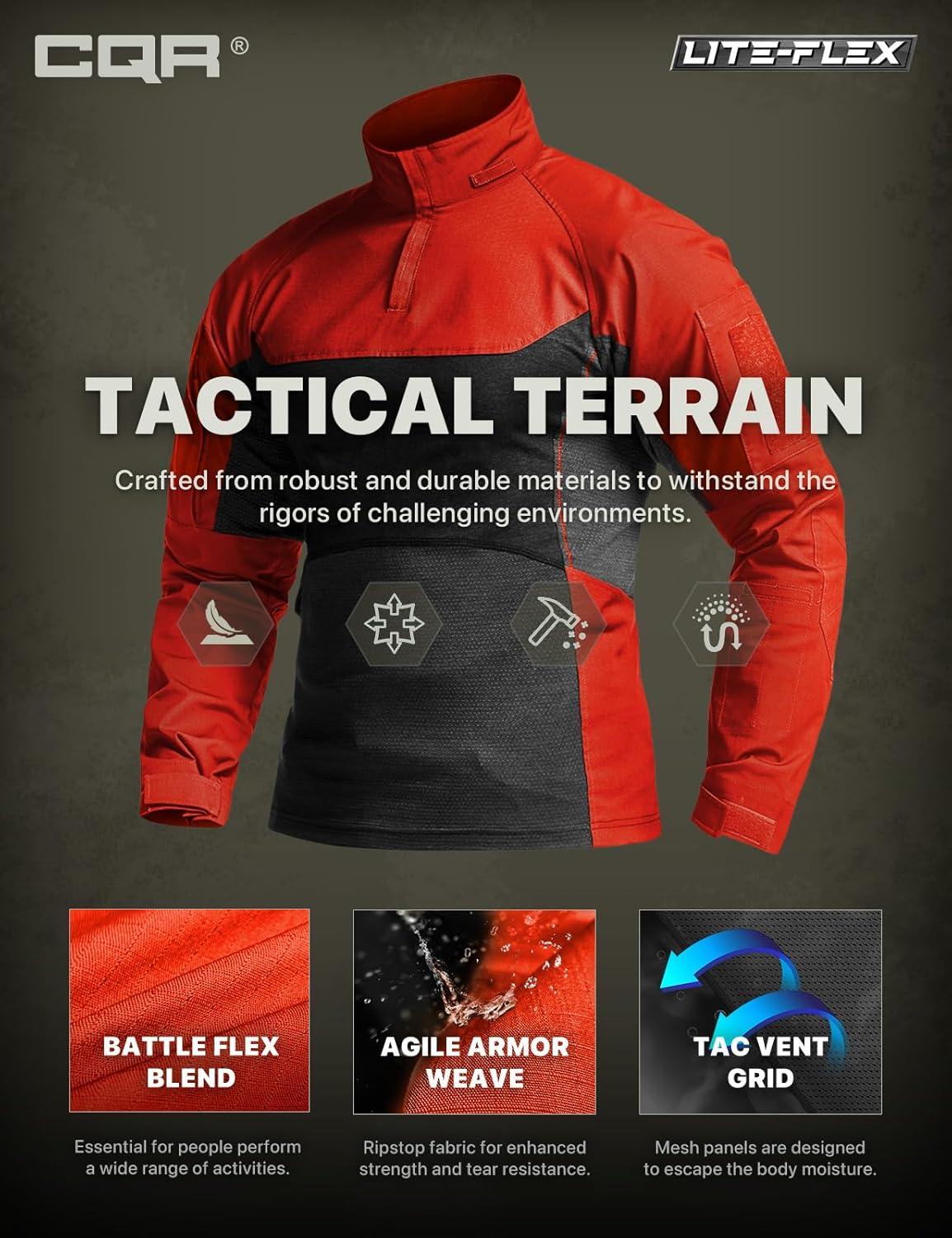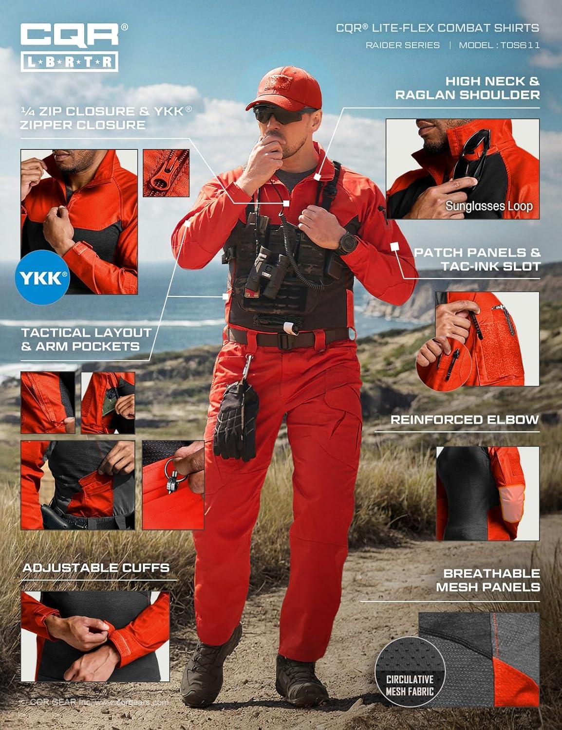 CQR Men’s Combat Shirt Tactical 1/4 Zip Long Sleeve Military BDU Shirts Camo EDC Top with Pockets(Raider Pro Rescue Orange)
