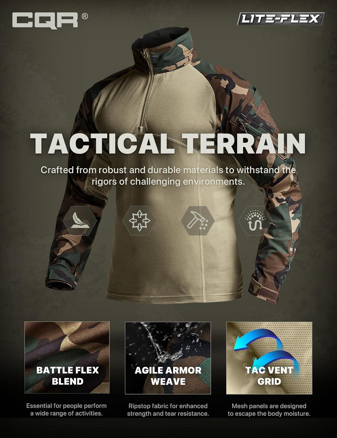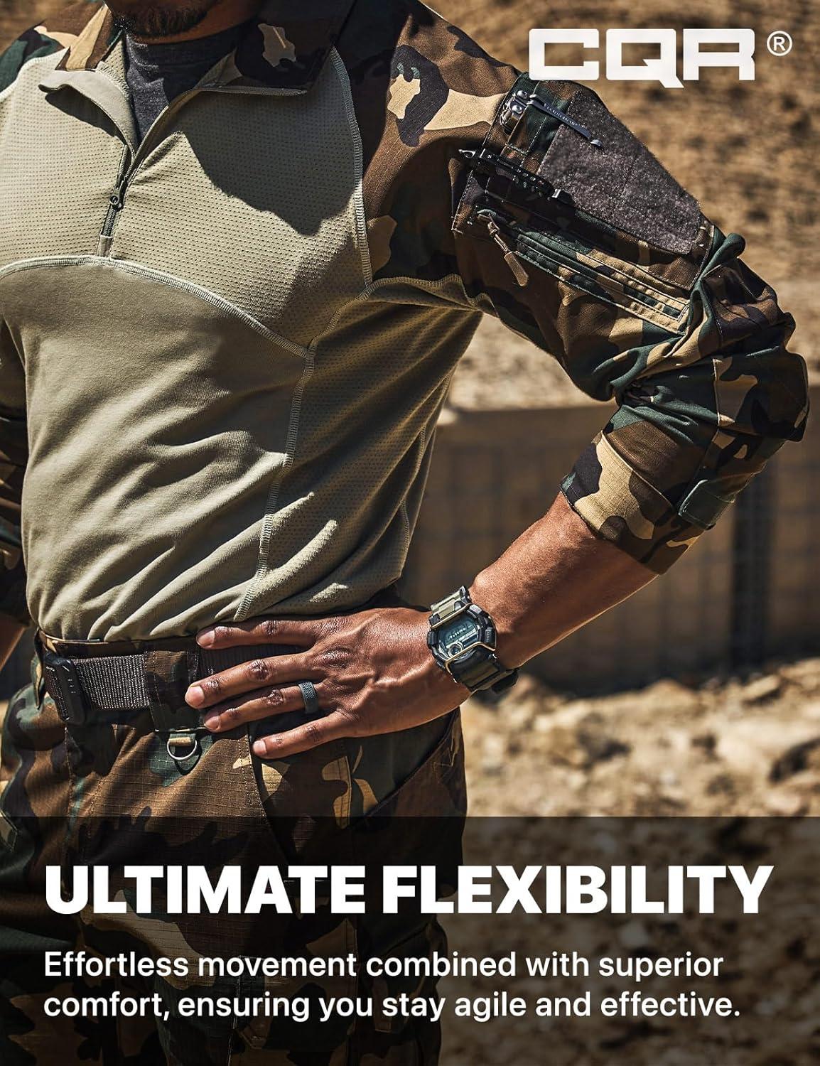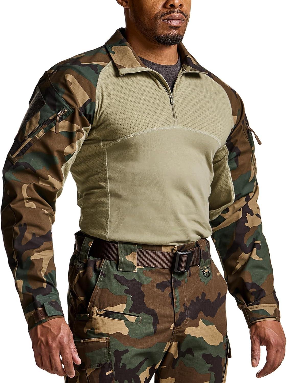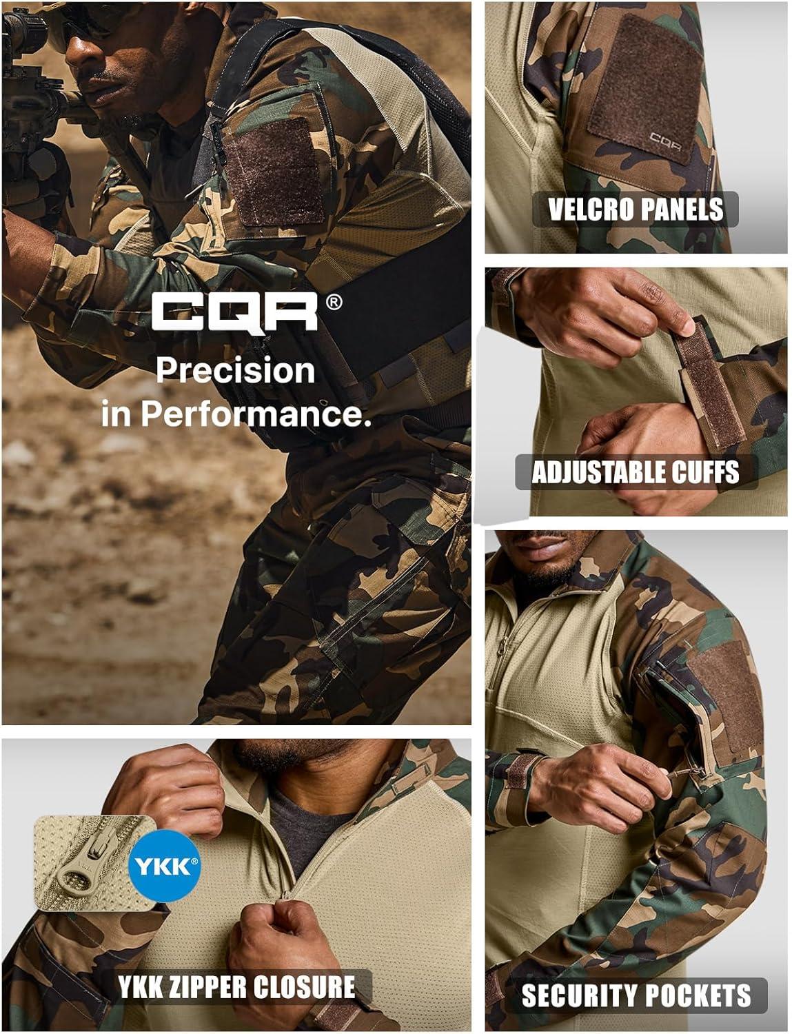 CQR Men’s Combat Shirt Tactical 1/4 Zip Long Sleeve Military BDU Shirts Camo EDC Top with Pockets(Raider Woodland)