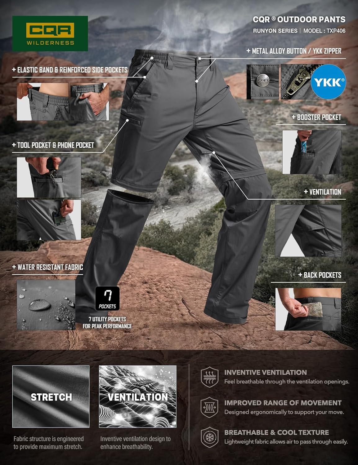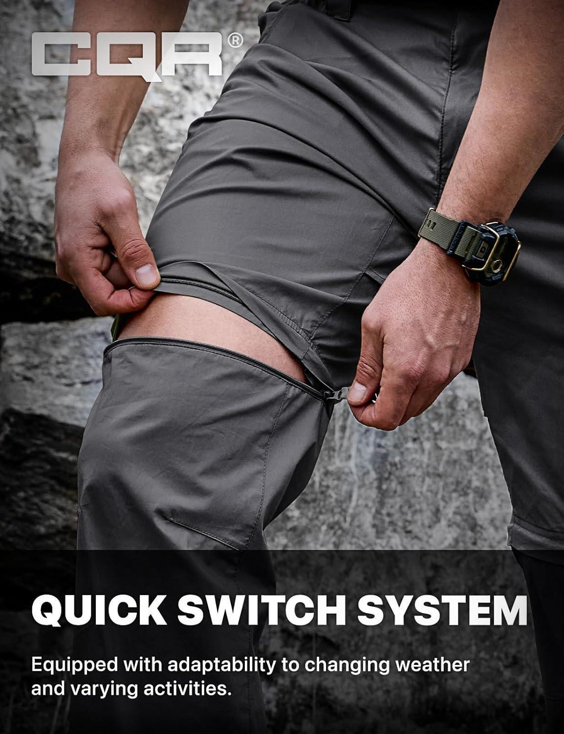 CQR Men’s Convertible Cargo Tactical Pants, Water Resistant Outdoor Hiking Pants, Zip Off Lightweight Stretch Work Pants(Runyon Charcoal)