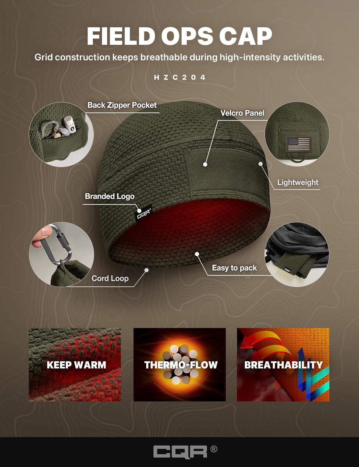 CQR Men’s Fleece Tactical Beanie, Lightweight Army Military Skull Cap, Soft Warm Winter Hat with Small Pocket(Grid Flex Army Green)