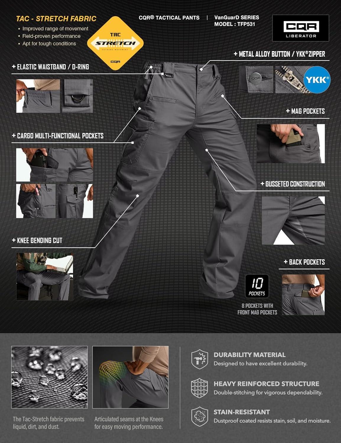 CQR Men’s Flex Stretch Tactical Pants, Water Resistant Ripstop Cargo Pants, Lightweight EDC Outdoor Work Hiking Pants(Tac-stretch Cargo Charcoal)