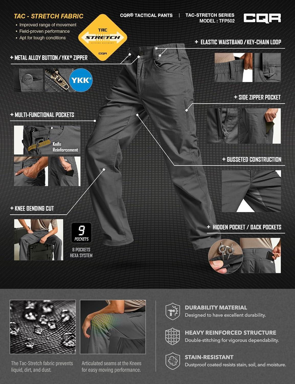 CQR Men’s Flex Stretch Tactical Pants, Water Resistant Ripstop Cargo Pants, Lightweight EDC Outdoor Work Hiking Pants(Tac-stretch Charcoal)
