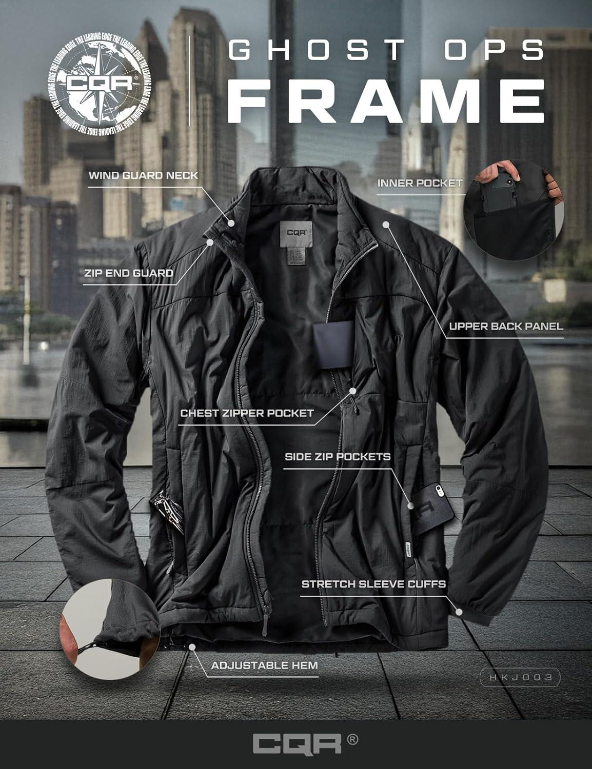 CQR Men’s Lightweight Insulated Jacket, Windproof Packable Water Resistant Warm Active Coat for Hiking Work Outdoor Tactical(Frame Black)