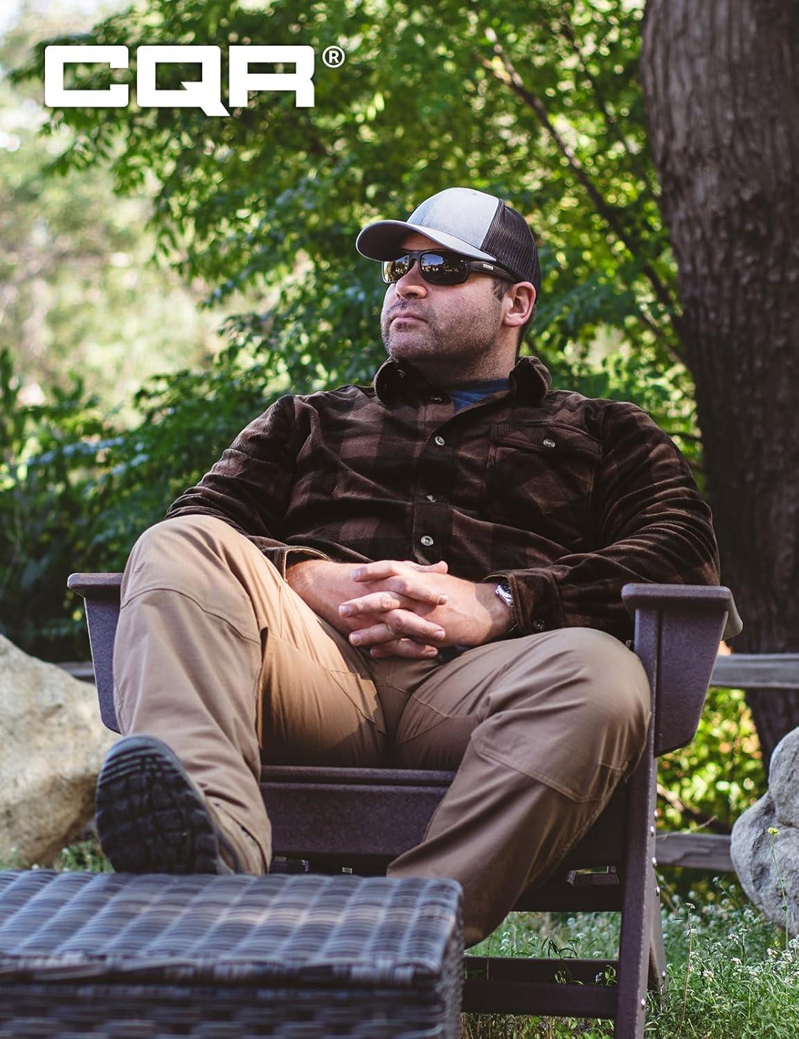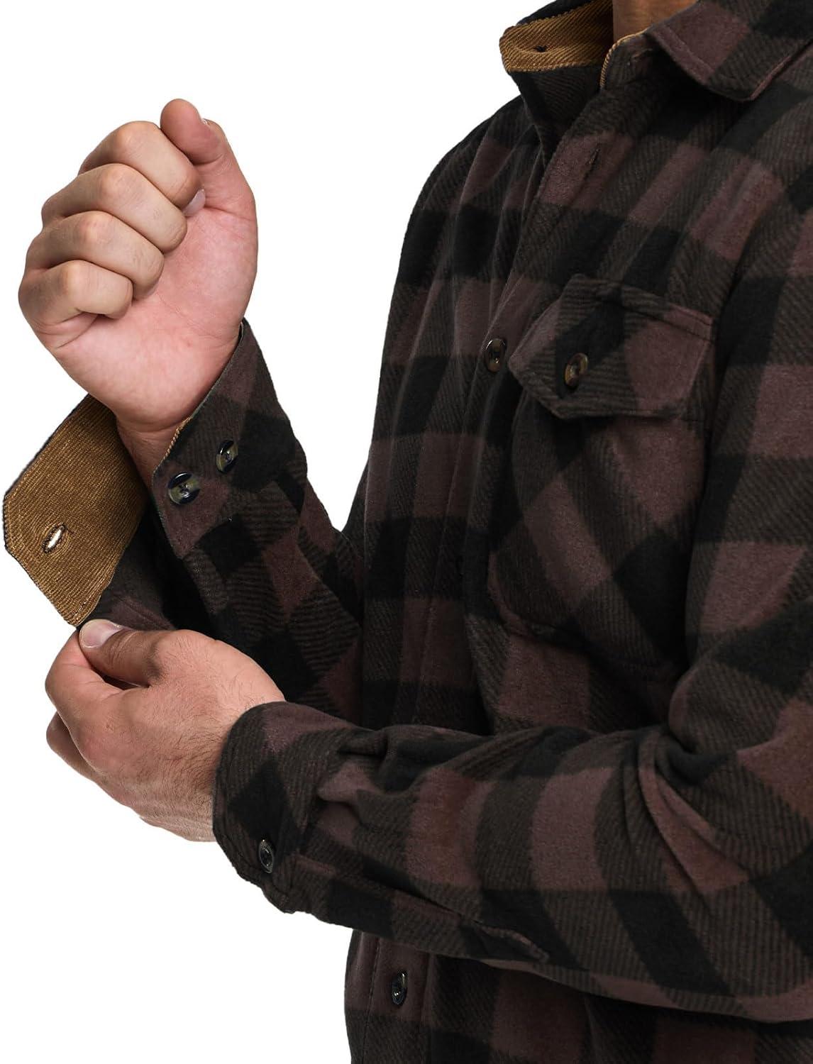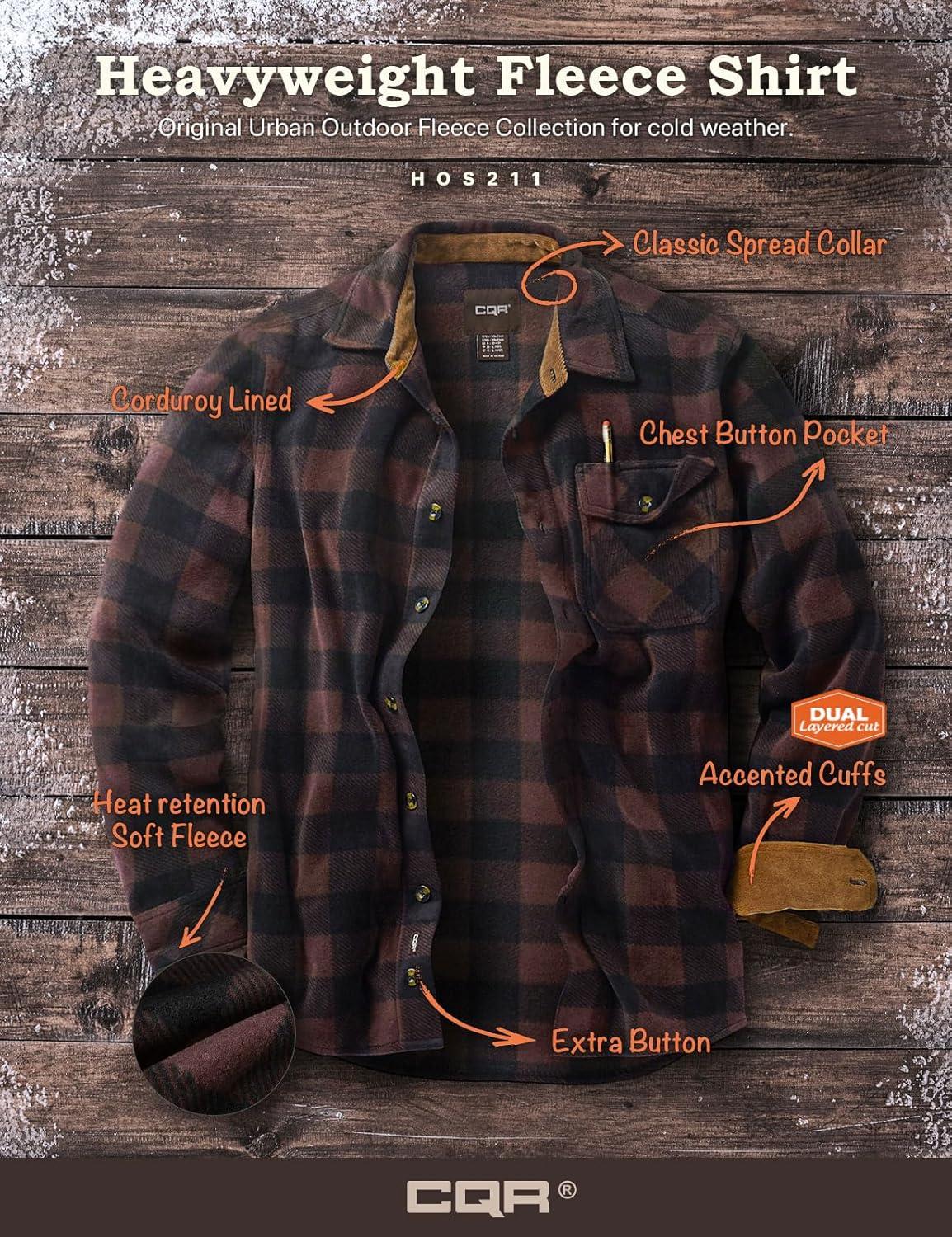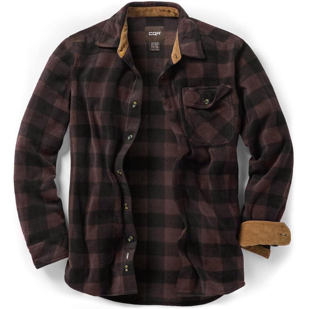 CQR Men’s Long Sleeve Heavyweight Fleece Shirts, Plaid Button Up Shirt, Warm Outdoor Casual Shirt with Pockets(One Pocket Dark Brown)