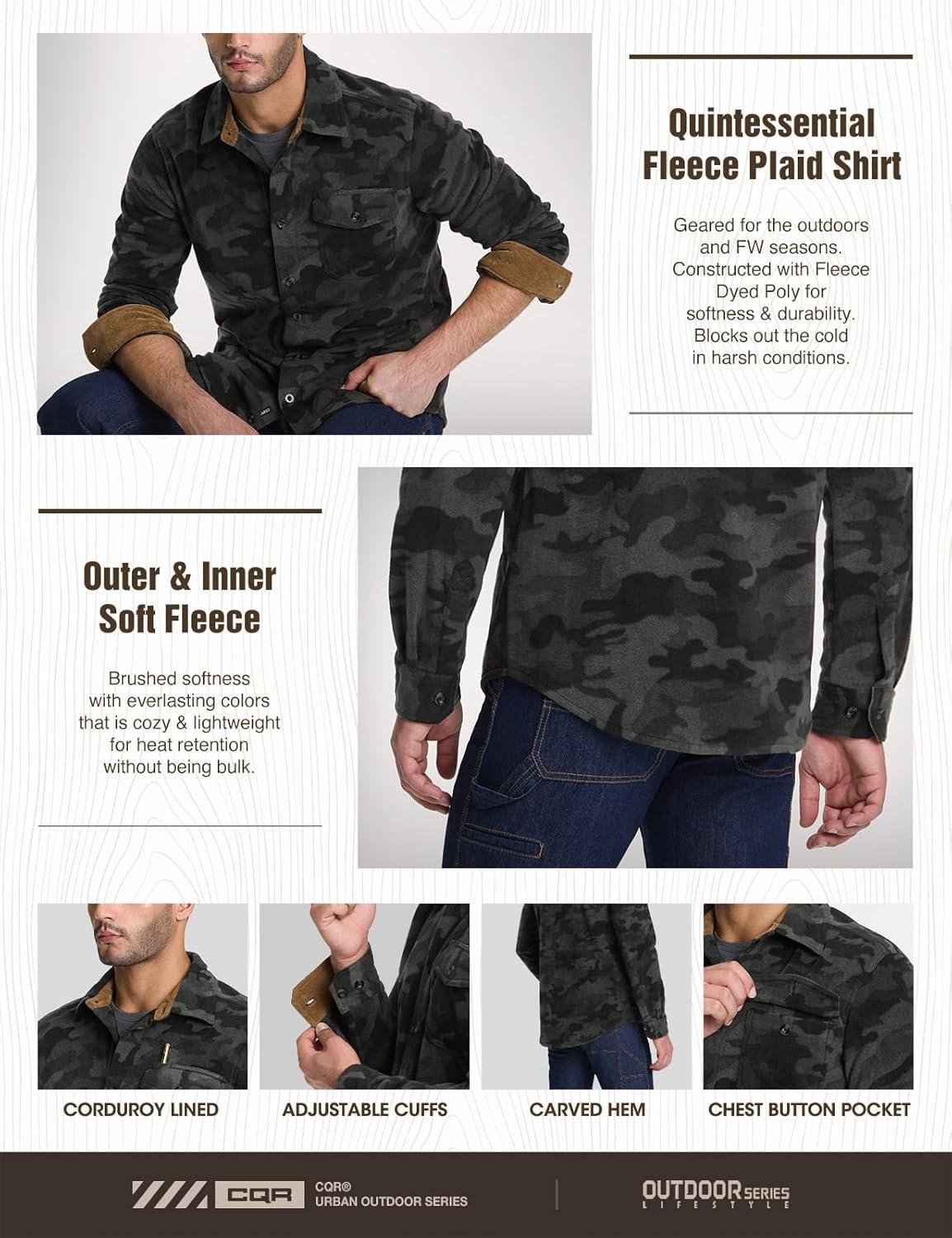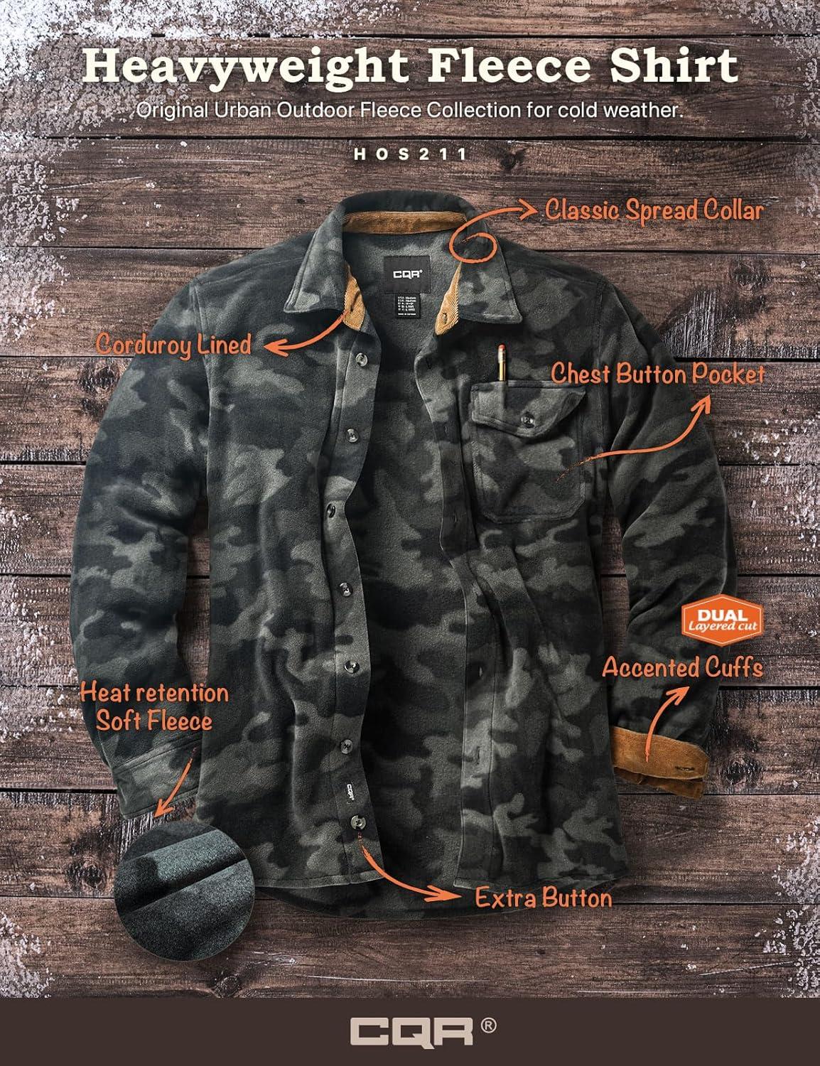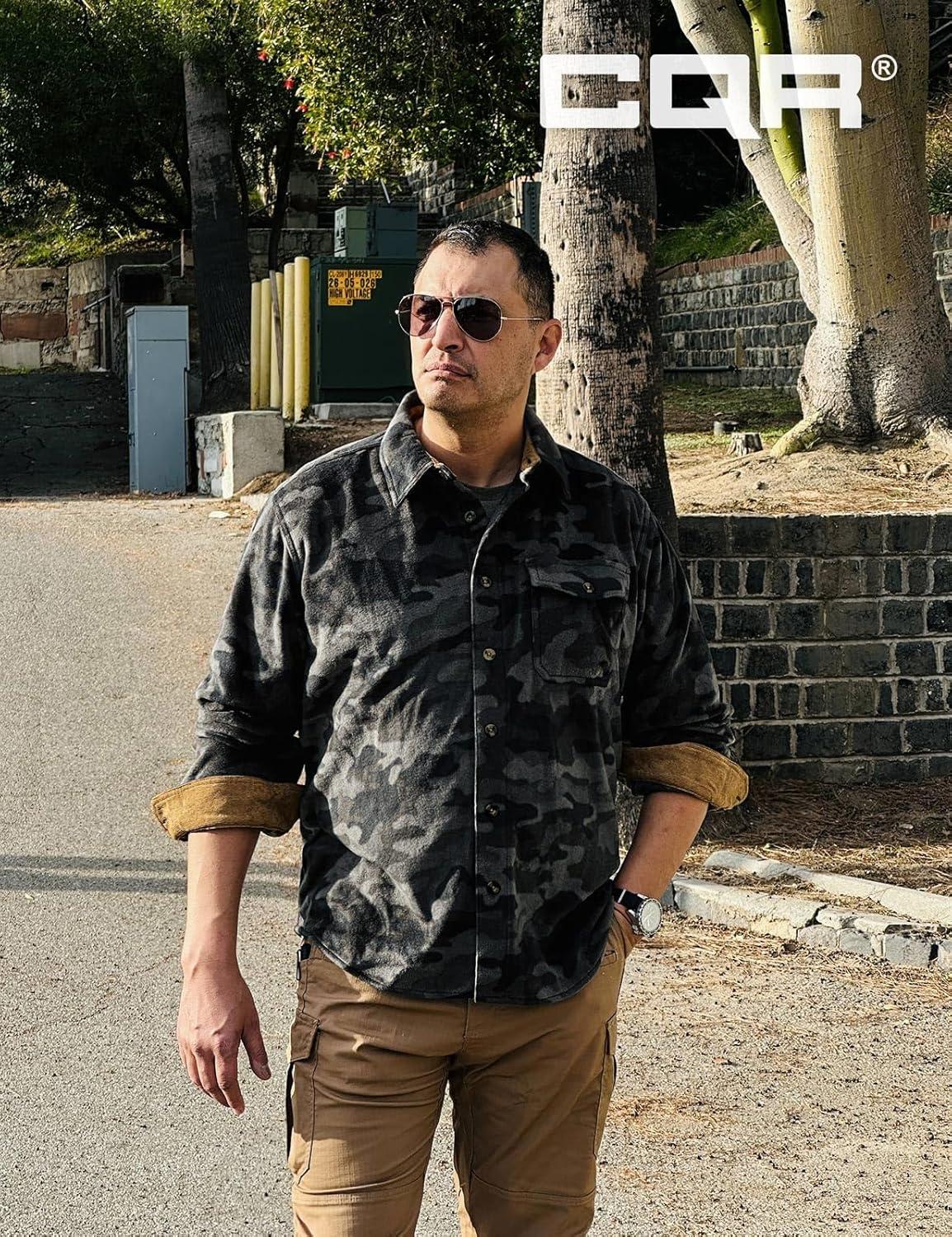 CQR Men’s Long Sleeve Heavyweight Fleece Shirts, Plaid Button Up Shirt, Warm Outdoor Casual Shirt with Pockets(One Pocket Urban Camo Black)