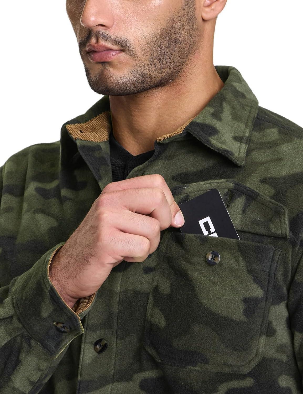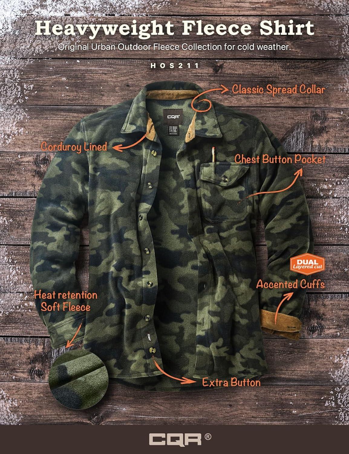 CQR Men’s Long Sleeve Heavyweight Fleece Shirts, Plaid Button Up Shirt, Warm Outdoor Casual Shirt with Pockets(One Pocket Woodland Camo Olive)