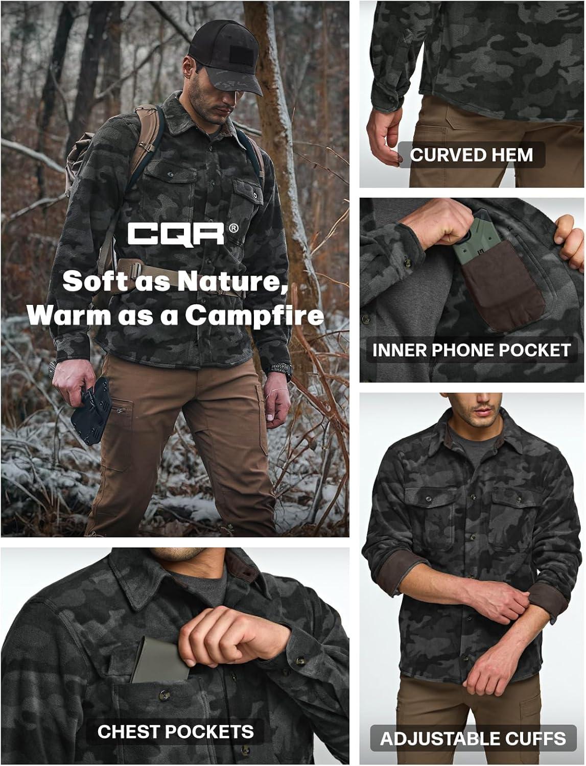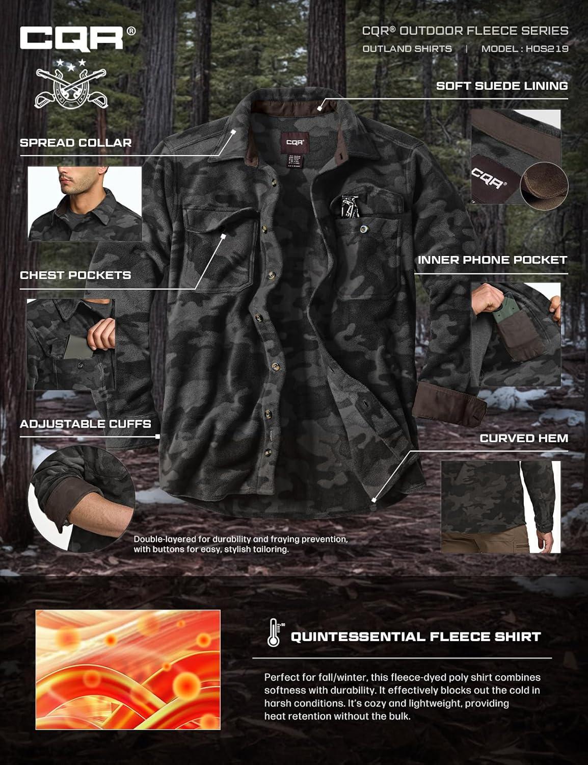 CQR Men’s Long Sleeve Heavyweight Fleece Shirts, Plaid Button Up Shirt, Warm Outdoor Casual Shirt with Pockets(Outland Camo Black)