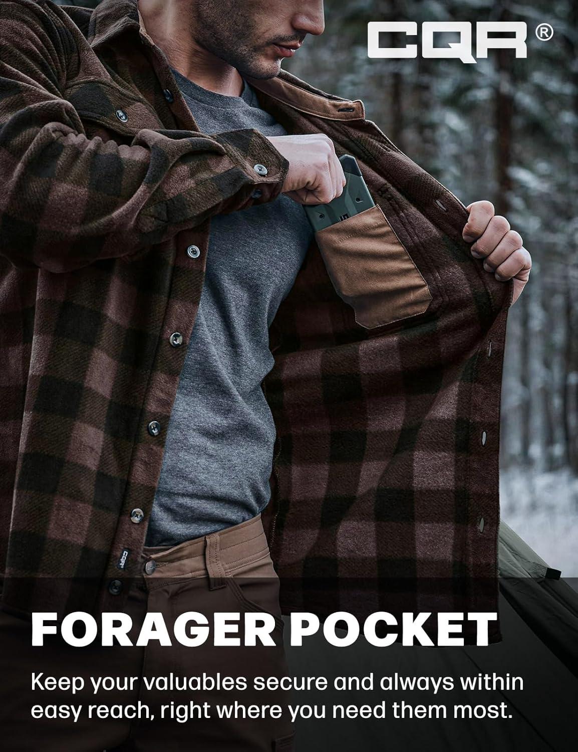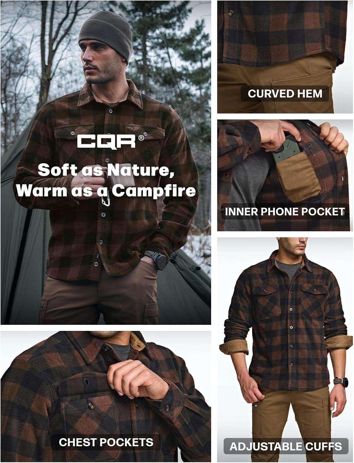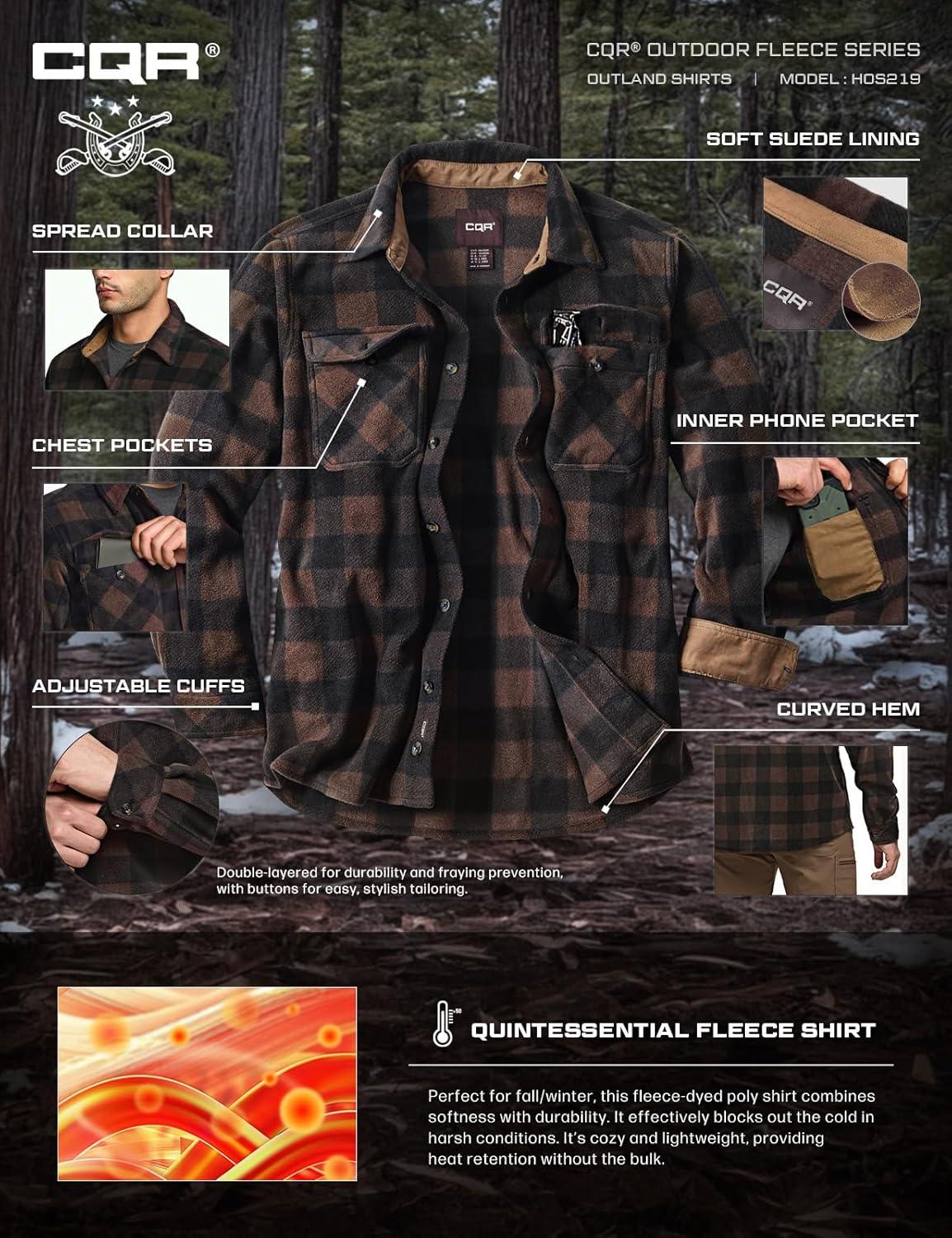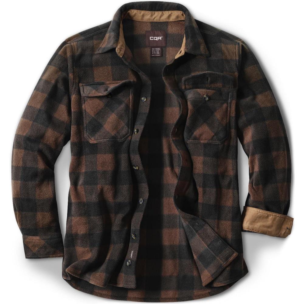CQR Men’s Long Sleeve Heavyweight Fleece Shirts, Plaid Button Up Shirt, Warm Outdoor Casual Shirt with Pockets(Outland Dark Brown)