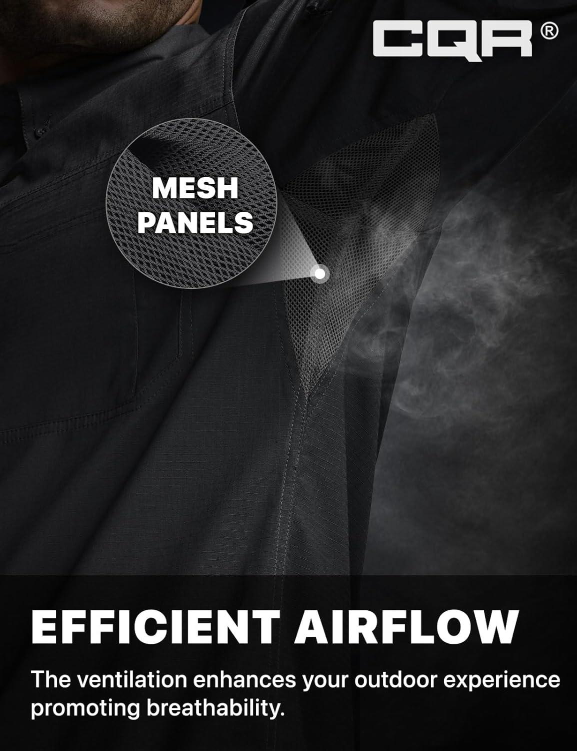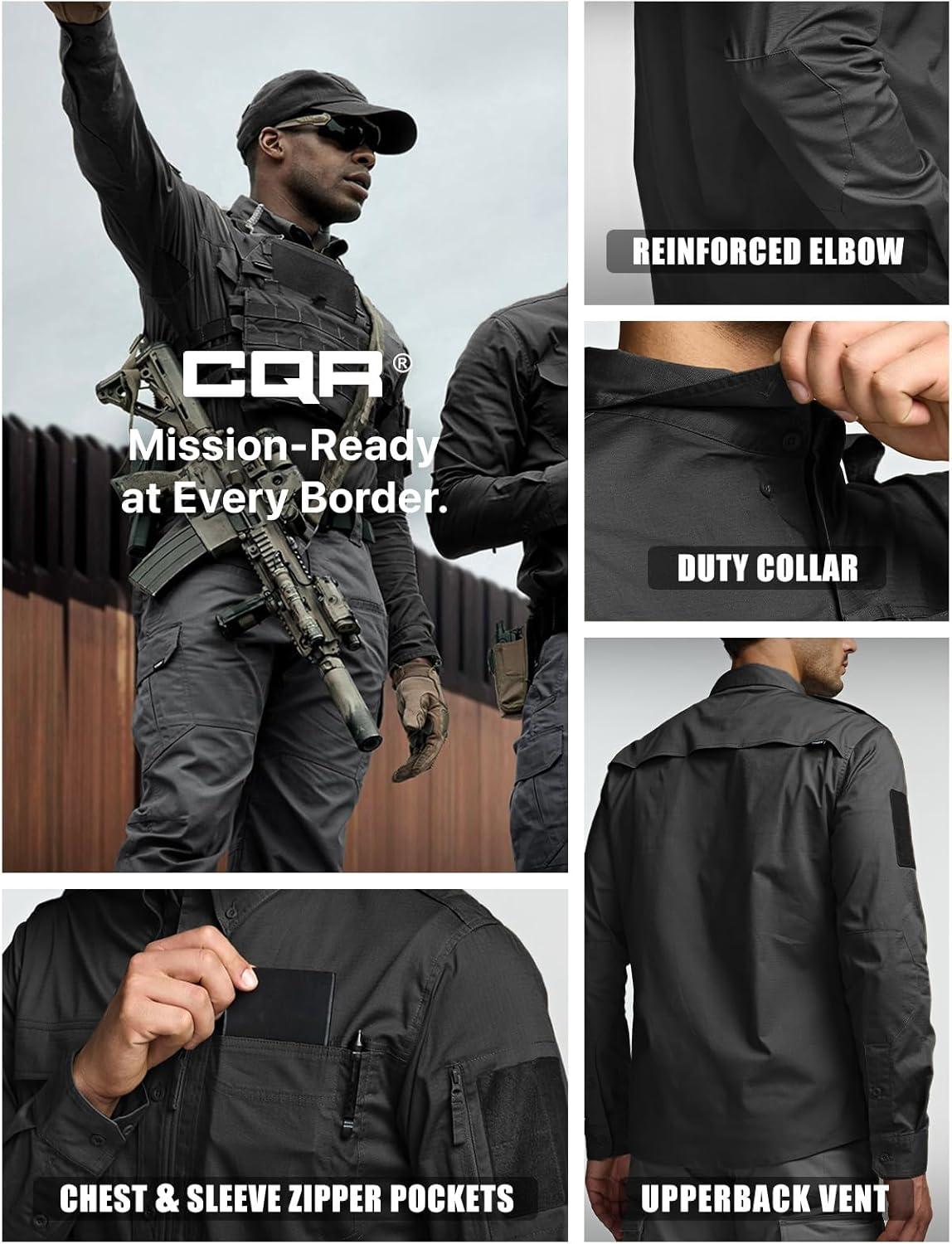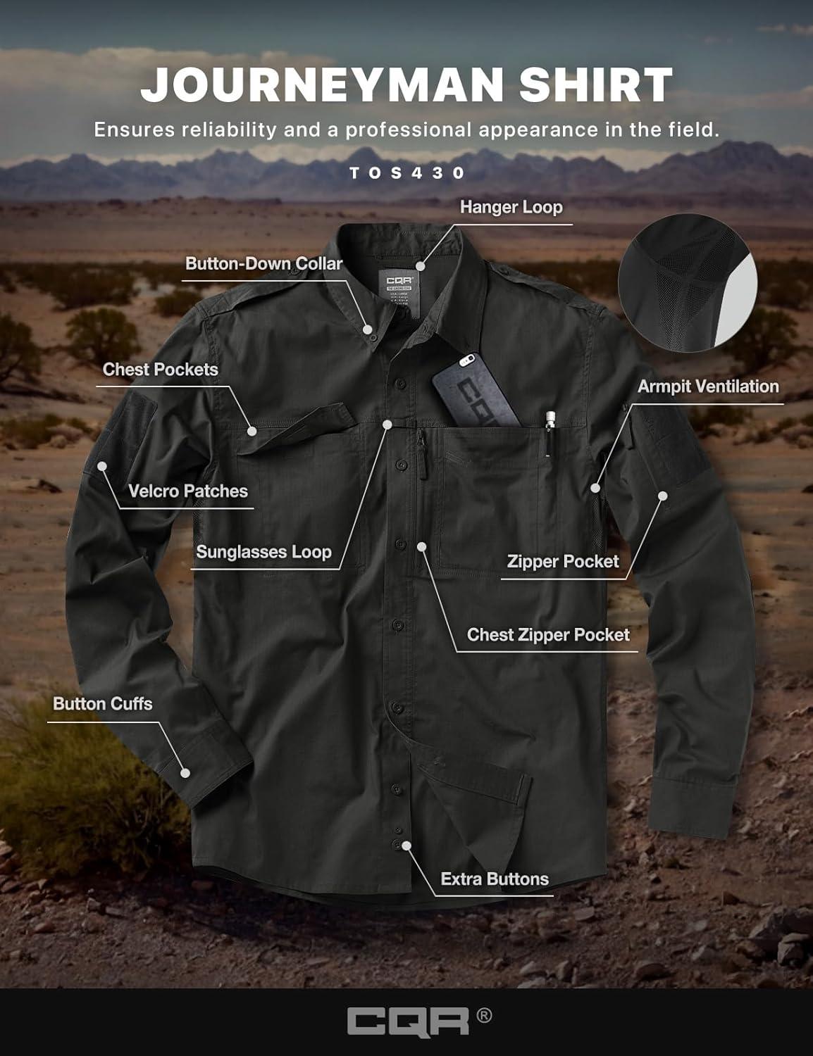 CQR Men’s Long Sleeve Tactical Shirts, Ripstop Military Work Shirts, UPF 50+ Breathable Button Down Outdoor Hiking Shirt(Journeyman Black)