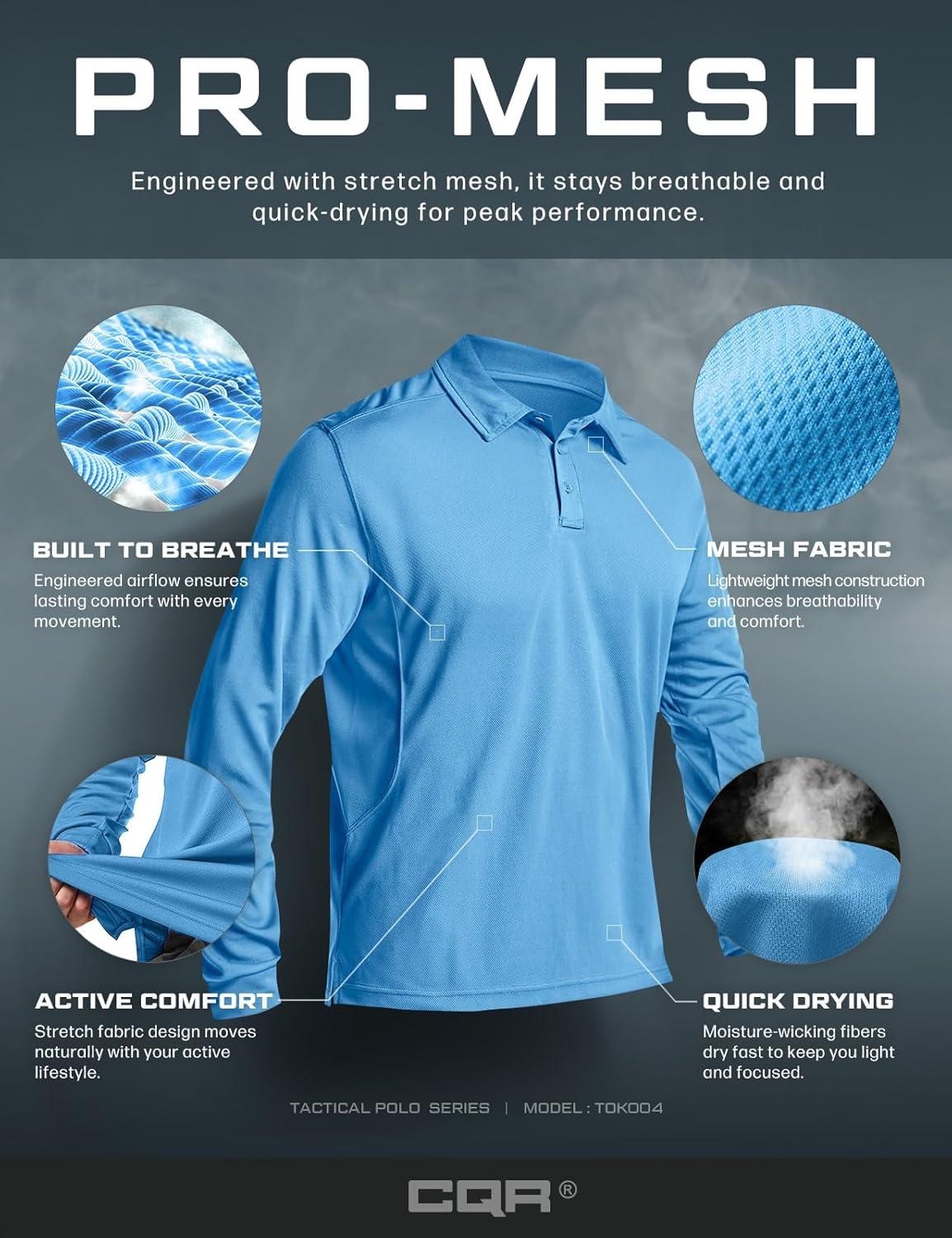 CQR Men’s Polo Shirt, Long Sleeve Tactical Shirts, Outdoor UPF 50+ Pique Shirt, Dry Fit Lightweight Golf Shirts(Frost Essential Long Aero Blue)