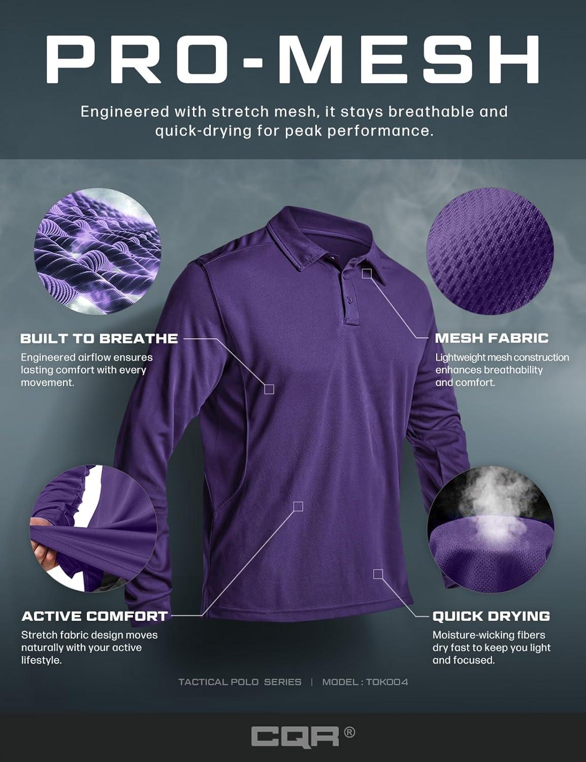 CQR Men’s Polo Shirt, Long Sleeve Tactical Shirts, Outdoor UPF 50+ Pique Shirt, Dry Fit Lightweight Golf Shirts(Frost Essential Long Purple)