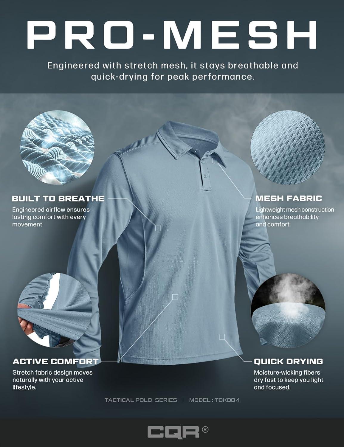 CQR Men’s Polo Shirt, Long Sleeve Tactical Shirts, Outdoor UPF 50+ Pique Shirt, Dry Fit Lightweight Golf Shirts(Frost Essential Long Stone Blue)
