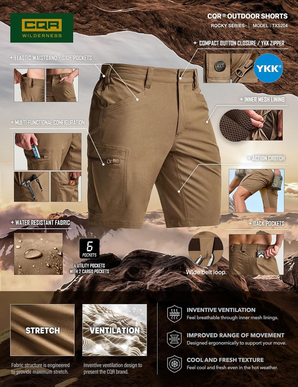 CQR Men’s Quick Dry Stretch Hiking Cargo Shorts, Lightweight Water Resistant Tactical Casual, Golf & Outdoor with Pockets(Rocky Hazelnut)