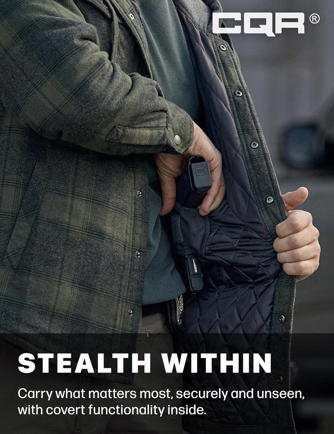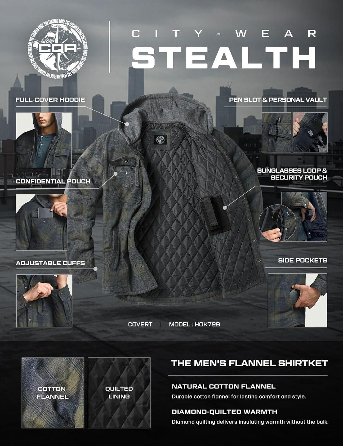 CQR Men’s Quilted Lined Flannel Hooded Shirt Jacket, Soft Warm Long Sleeve Outdoor Cotton Plaid Shirt Jackets(Stealth Amazon Grey)