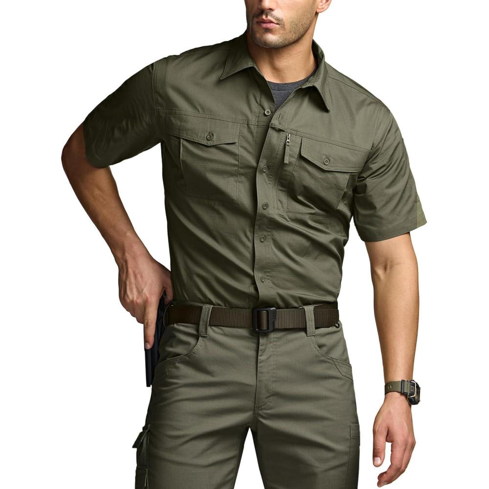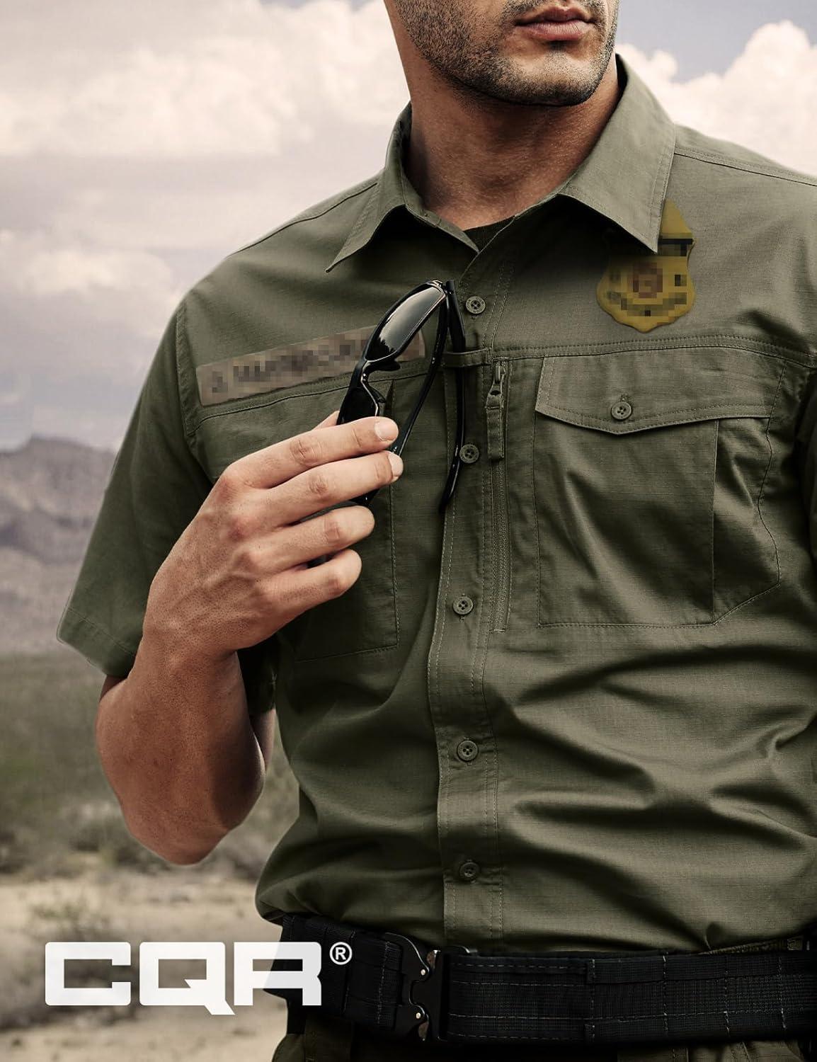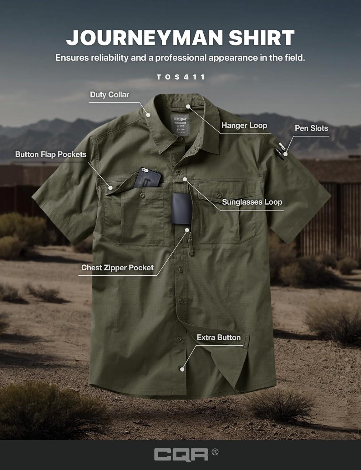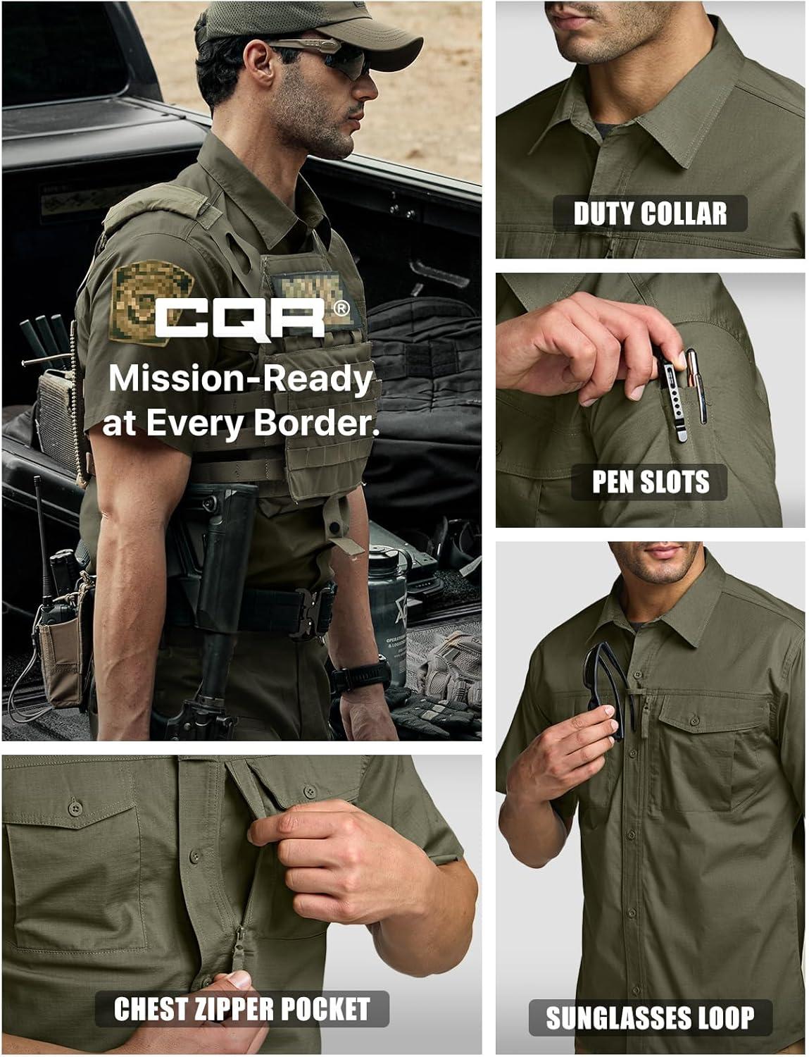 CQR Men’s Short Sleeve Tactical Shirts, UPF 50+ Ripstop Military Work Shirts, Breathable Button Down Outdoor Hiking Shirt(Journeyman Soil Green)