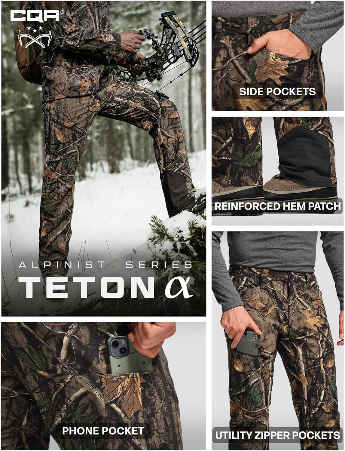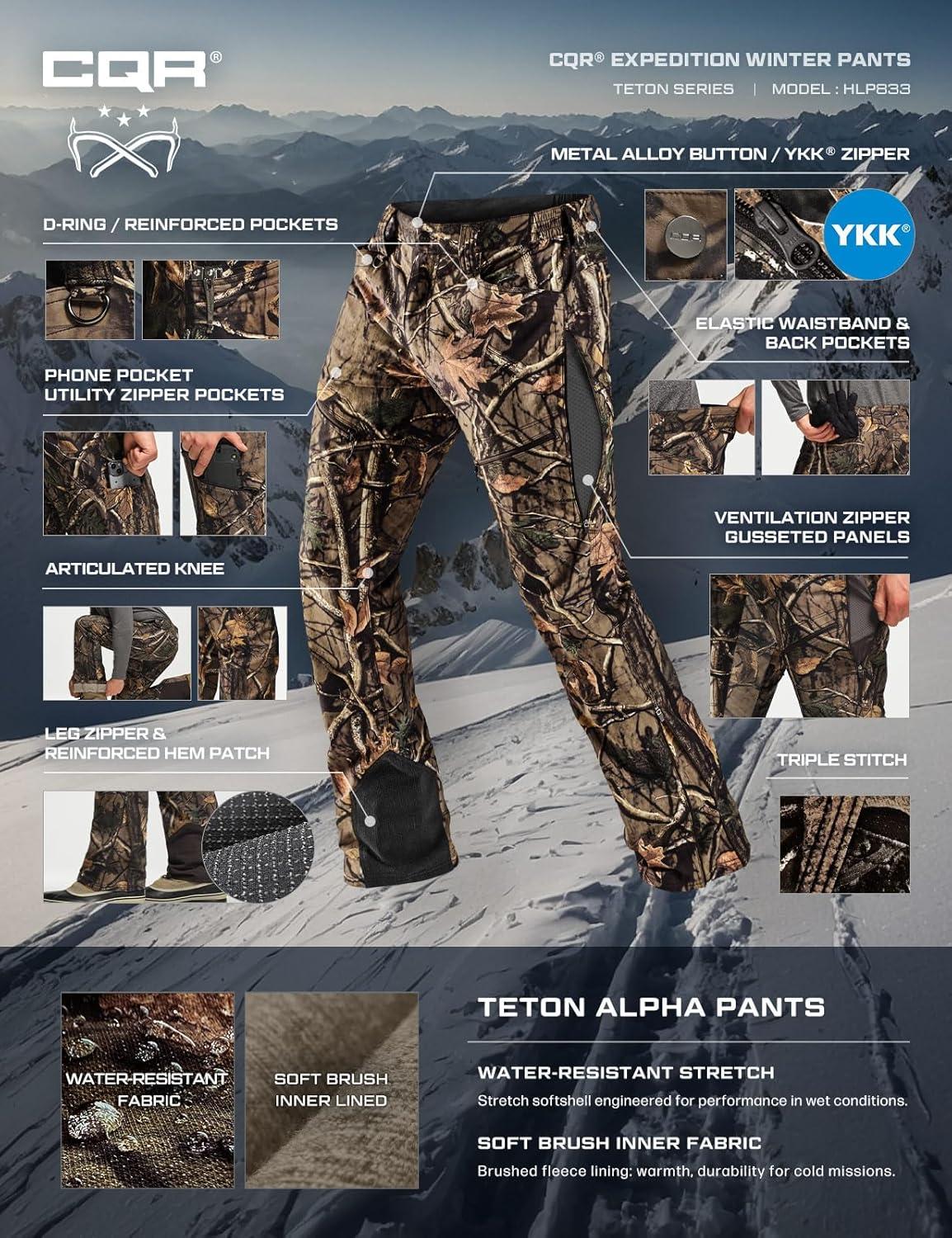 CQR Men’s Softshell Fleece Lined Winter Hiking Pants, Water Resistant Insulated Thermal, Outdoor Tactical Warm Snow Ski Pants(Teton Alpha Hunting Camo)